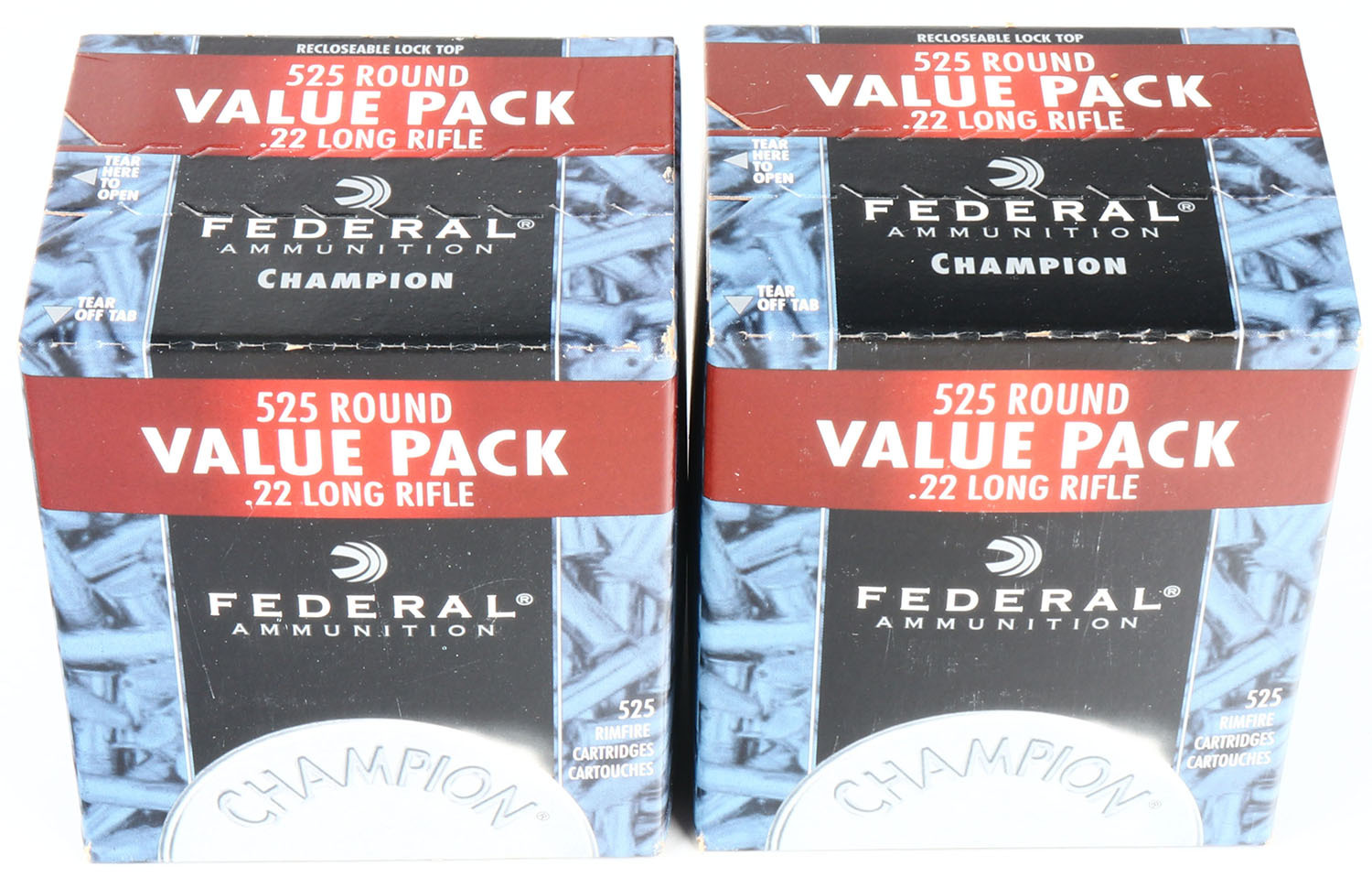 Federal, Lot of (2), Champion Value Pack, .22 Long Rifle, 36 Grain Copper Plated Hollow Point, FULL & SEALED, 525rds. (x2) 1pc. Blue black & red bulk box, boxes are near mint with minty color, only very minor corner wear. Grade: Excellent ++ - Value: 50 to 75