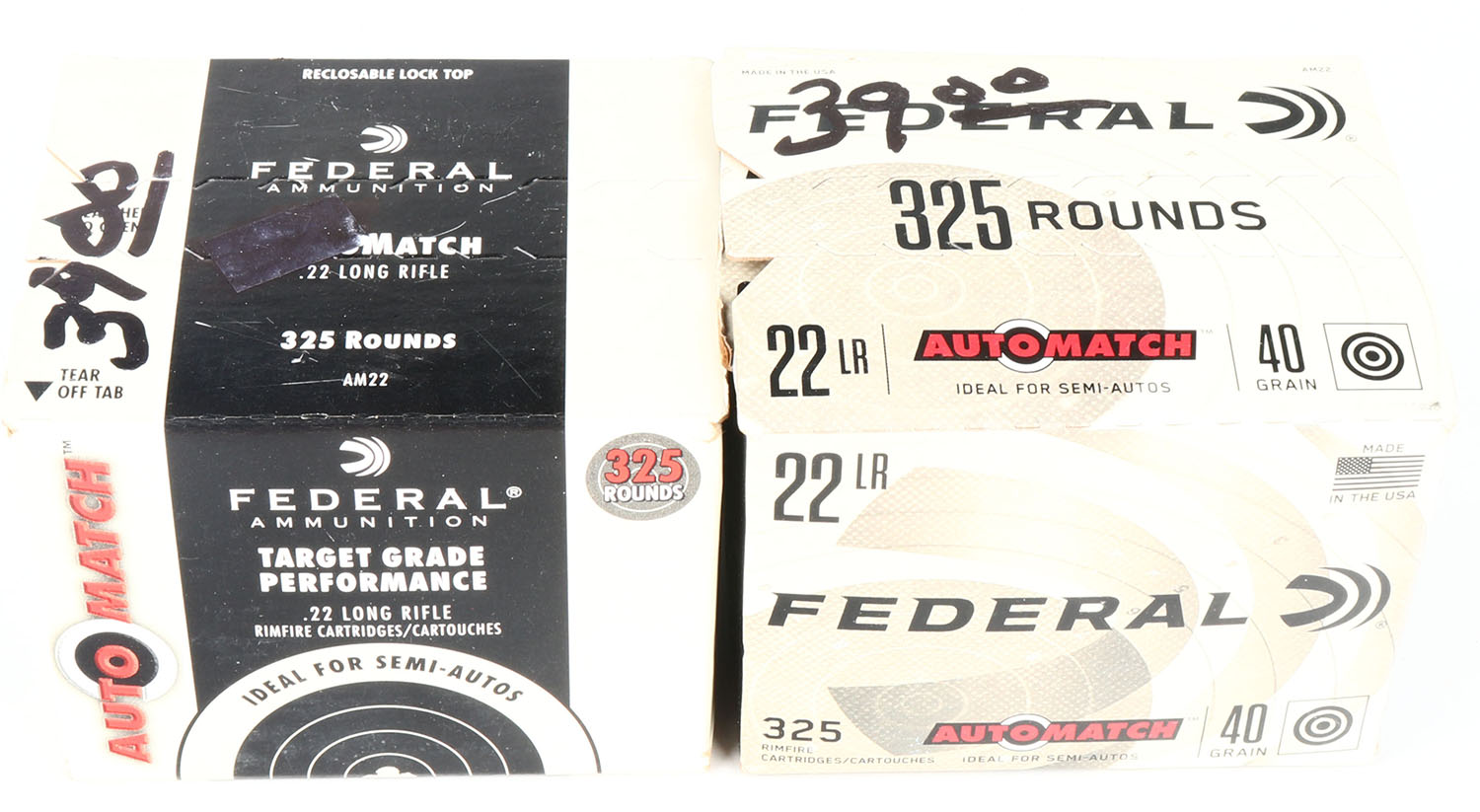 Federal, Lot of (2), AutoMatch, .22 Long Rifle, Ideal for Semi-Autos, 40 Grain Solid, 1200 FPS, FULL & SEALED 325 rds. 1pc. Tan & black bulk box, boxes are near mint with minty color, only very minor corner wear, tops have been written on, edges are crisp. Grade: Excellent + - Value: 30 to 45