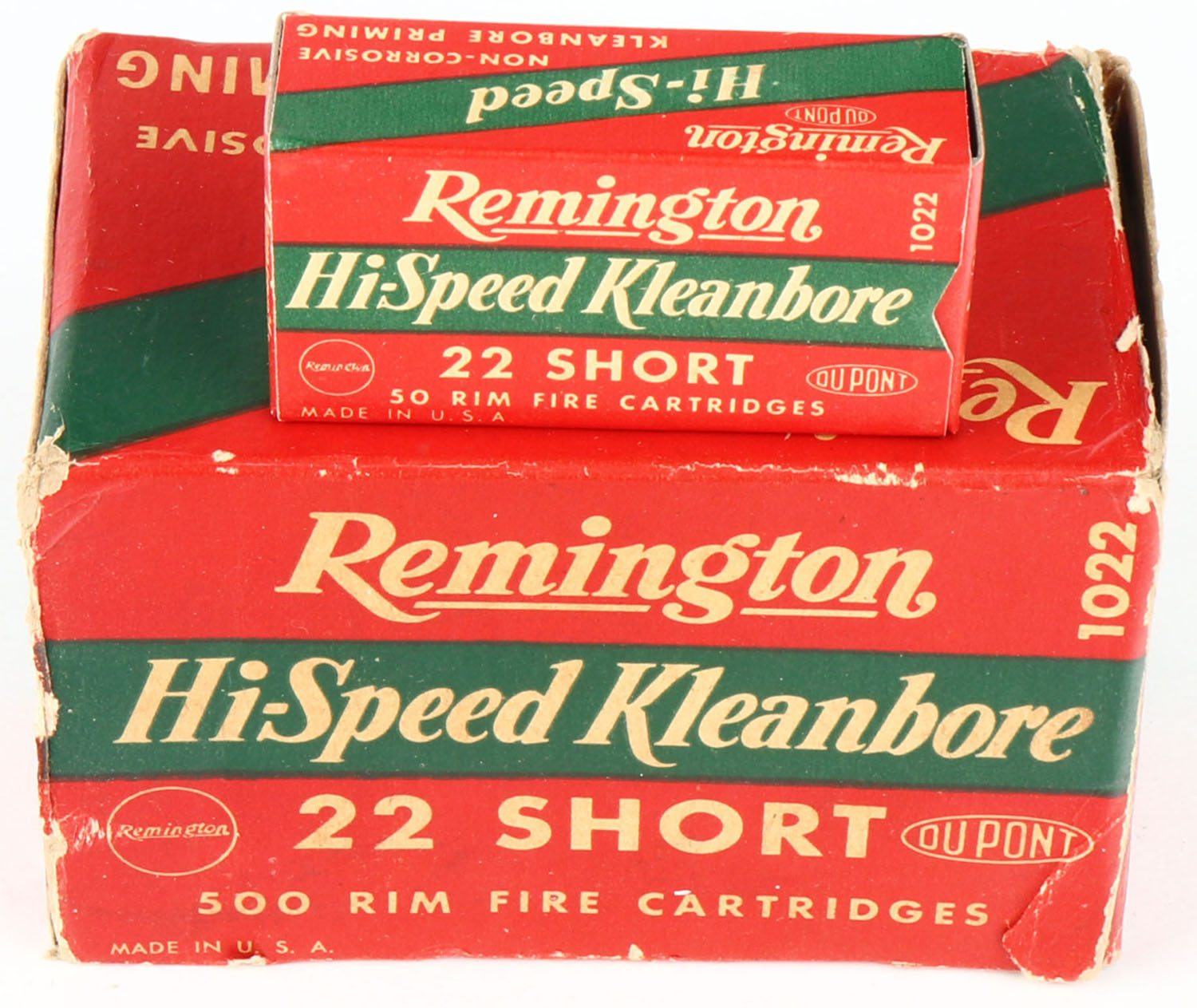 Remington, Hi-Speed Kleanbore, .22 Short, Full, 500rds. 1pc. Red green & buff brick, left end flap is torn, right end flap is nearly completely torn, corner wear, several partial seam splits, some edge wear, inside boxes are excellent. Grade: Good - Value: 70 to 100
