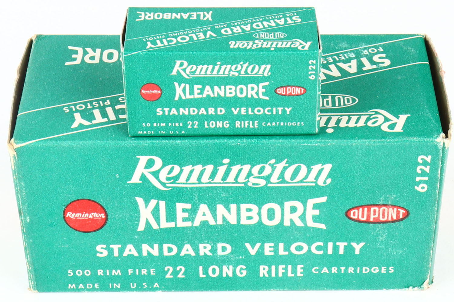 Remington, Kleanbore Standard Velocity, .22 Long Rifle, Full, 500rds. 1pc. Green white & red brick, brick is solid with excellent color, minor corner wear, edges are mostly crisp, end flaps are solid, inside boxes are minty. Grade: Excellent ++ - Value: 90 to 135