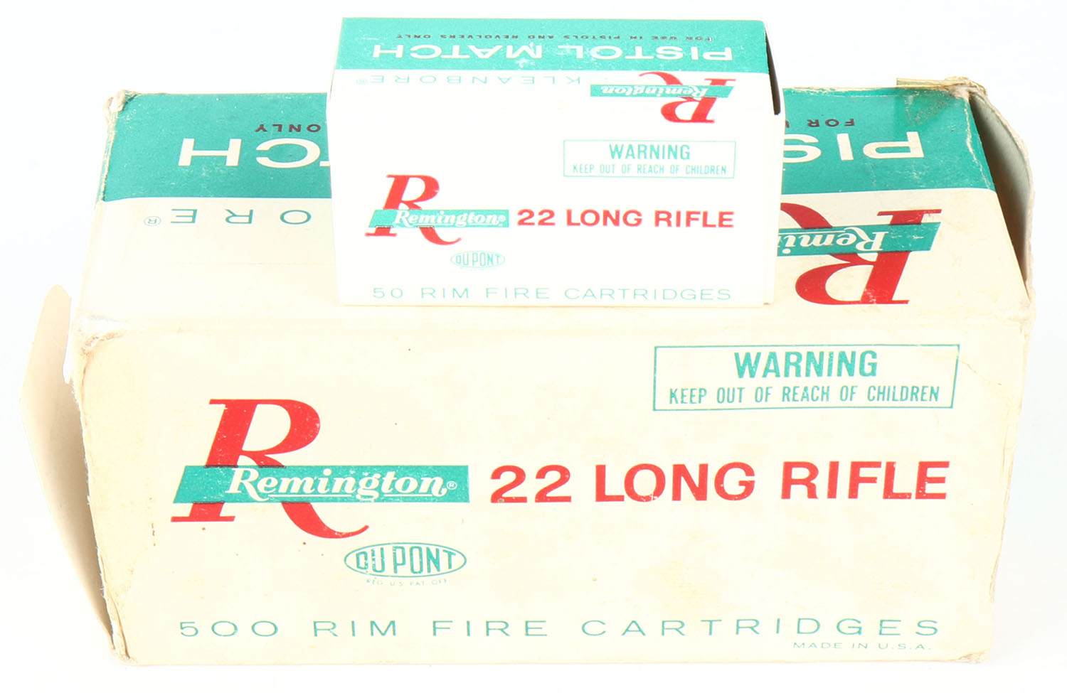 Remington, Pistol Match, .22 Long Rifle, Partial 6 boxes, 1pc. White green & red brick, missing left end flap, very good color, some age soiling & corner wear, very minor edge wear, right end flap is solid, inside boxes are excellent to minty. Grade: Very Good - Value: 30 to 45