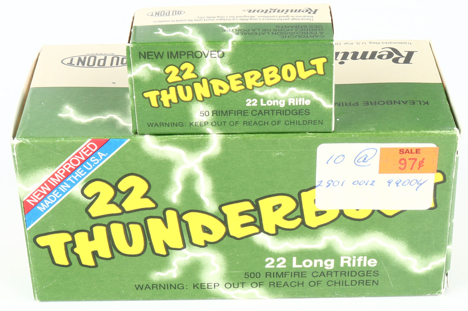 Remington, New Improved 22 Thunderbolt, .22 Long Rifle, Full, 1pc. Green gray & yellow brick, brick is solid with excellent to minty color, sticker on top, very minor corner wear, edges are crisp, end flaps are solid, inside boxes are minty. Grade: Excellent + - Value: 24 to 36