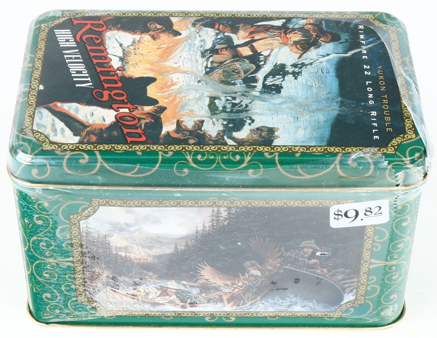 Remington, Limited Edition Collectors Tin, .22 Long Rifle, High Velocity, 1pc. FULL & SEALED, 400rds. Hinged tin features ''Yukon Trouble'' Classic Remington advertisement artwork. Grade: MINT - Value: 60 to 90