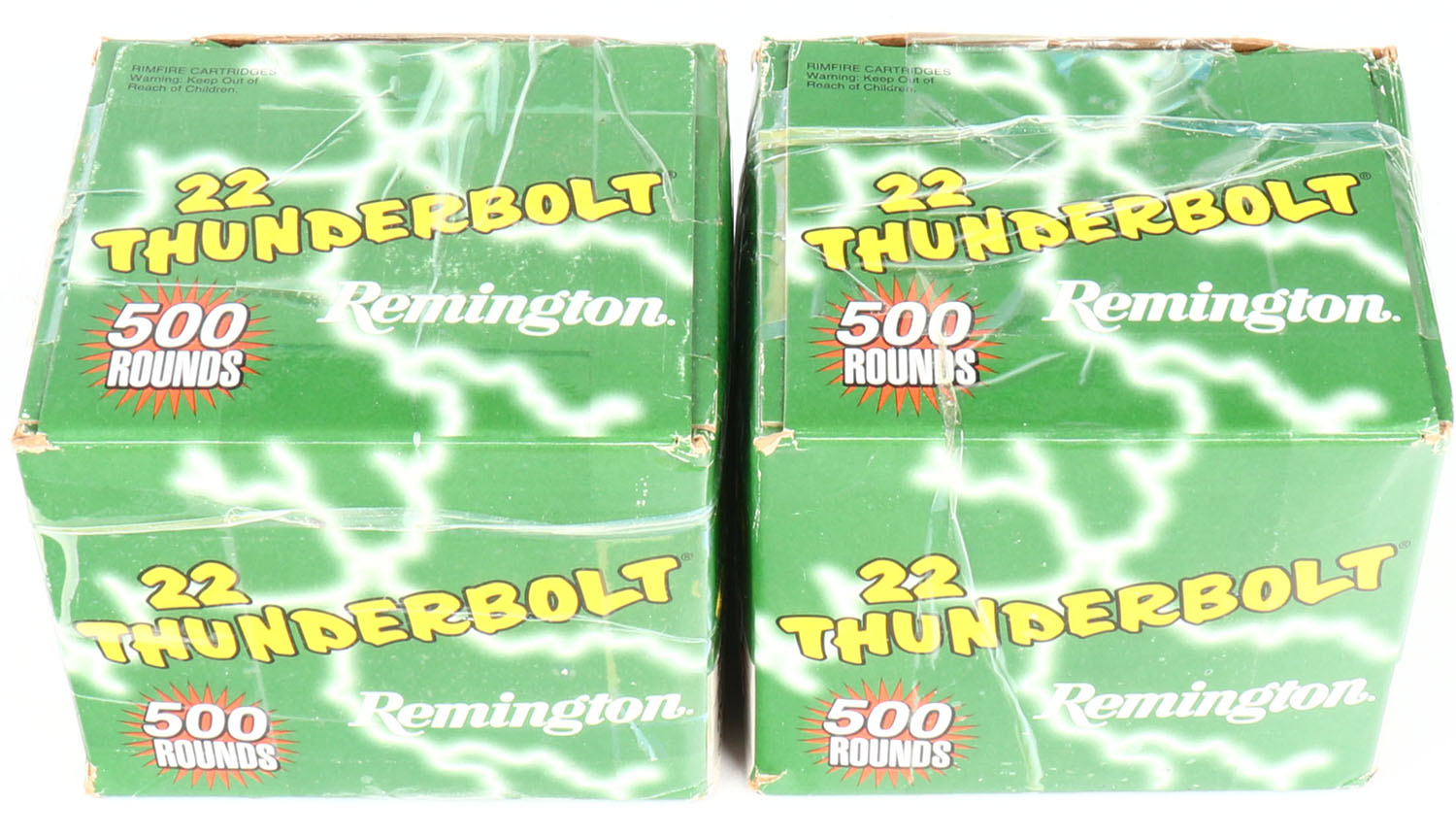 Remington, Lot of (2) Thunderbolt, .22 Long Rifle, High Velocity, both boxes FULL & SEALED, 500rds. (x2), 1pc. Green gray & yellow bulk boxes, boxes are both covered in tape, minty color, some corner wear. Grade: Very Good ++ - Value: 36 to 54