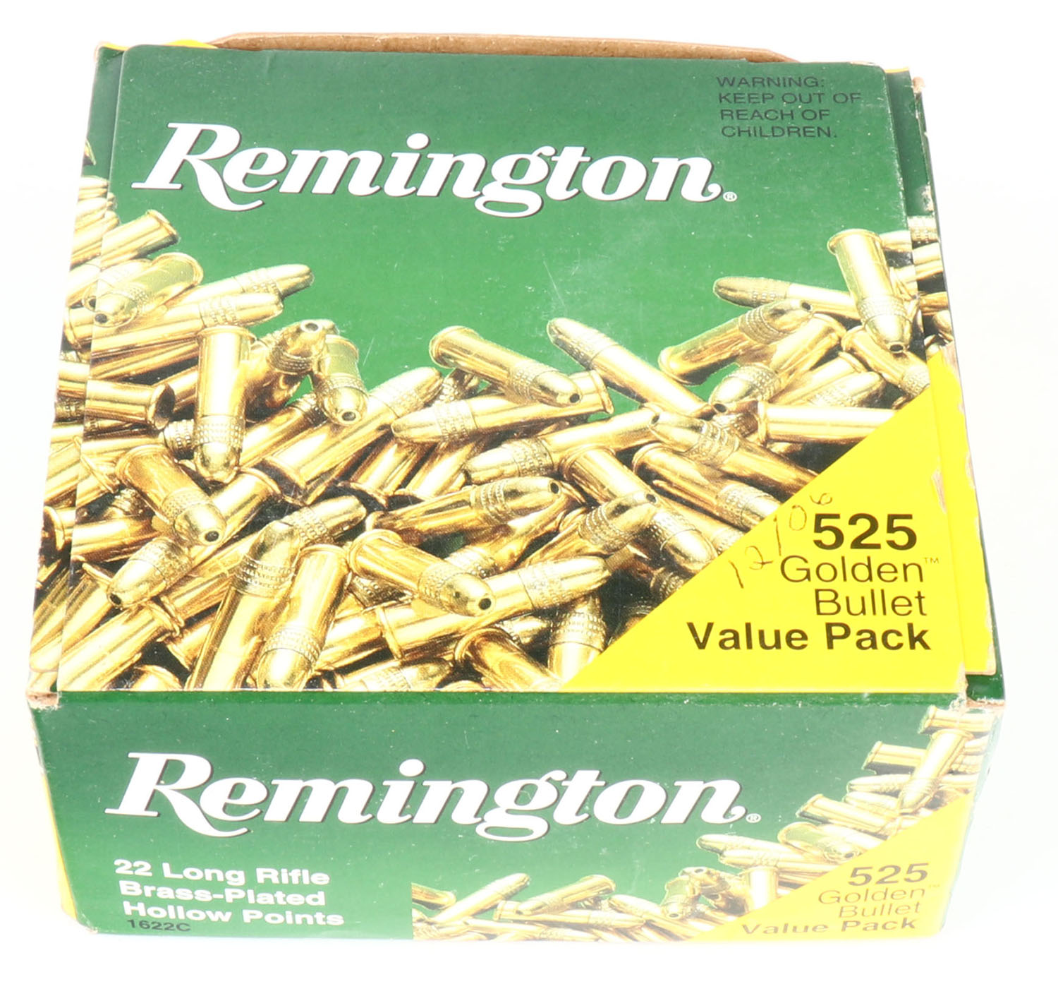 Remington, Golden Bullet Value Pack, .22 Long Rifle Hollow Point, Brass Plated, Full 525rds. 1pc. Green & yellow bulk box, box is solid with minty color, very minor corner wear, edges are crisp, top flap is solid, ammo is minty. Grade: Excellent ++ - Value: 20 to 30