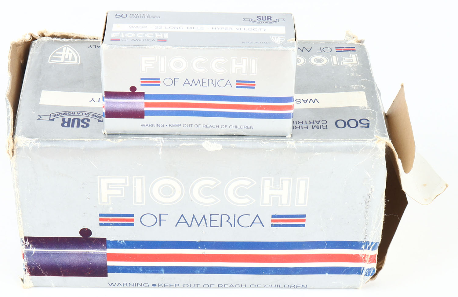 Fiocchi, Wasp, .22 Long Rifle, Hyper Velocity, Full, 500rds. 1pc. Silver blue & red brick, missing right end flap, partial seam split to bottom back edge, very good to excellent color, some shelf wear, corner wear, edge wear, left end flap is solid, inside boxes are minty. Grade: Good ++ - Value: 40 to 60