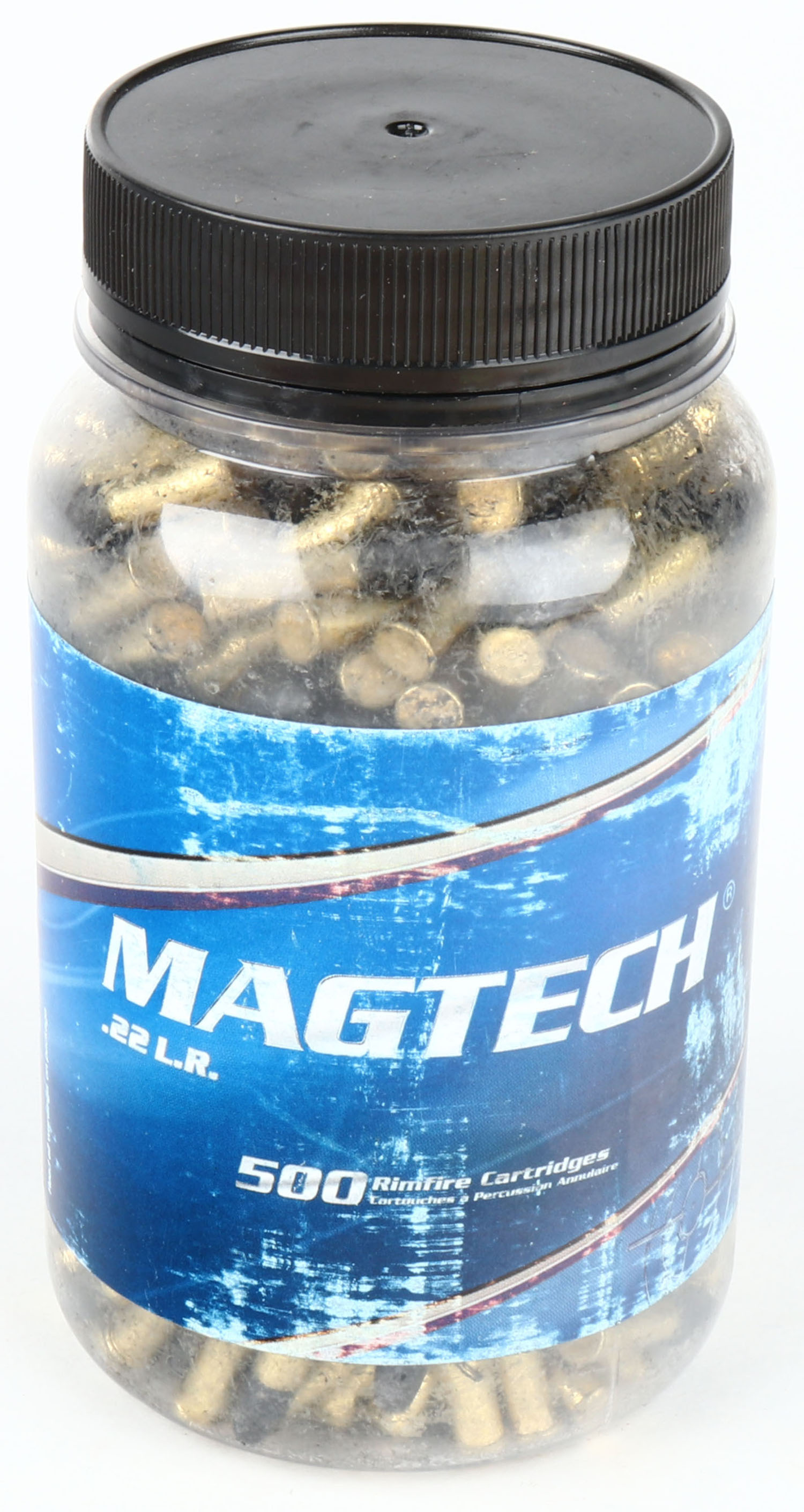 MagTech, .22 Long Rifle, 40 Grain Lead Round Nose, Standard Velocity, FULL & SEALED, 2pc. Clear plastic jar, jar is solid, slightly cloudy from lead lubrication, label is has excellent color with minor shelf wear, ammo appears minty. Grade: Excellent ++ - Value: 24 to 36