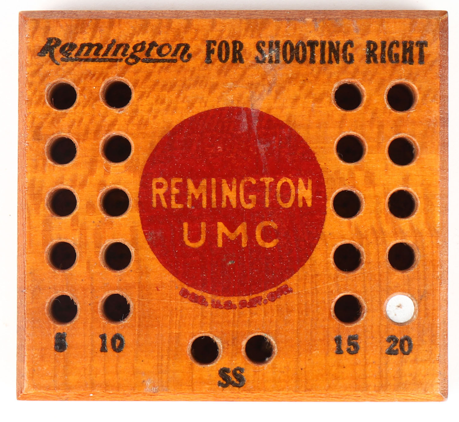 REM-UMC, Camp Perry style Cartridge stand, stained wood with red painted REM-UMC ball, notches for 22rds. Grade: Excellent ++ - Value: 50 to 75