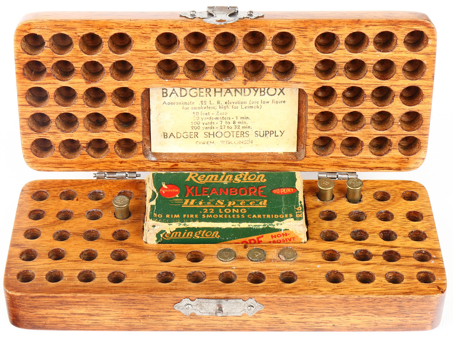 Badger Shooters Supply, Camp Perry Style box, very nice stained wood with brass latch, notches for 90 rounds & 50rd. .22 box. Grade: Excellent ++ - Value: 40 to 60