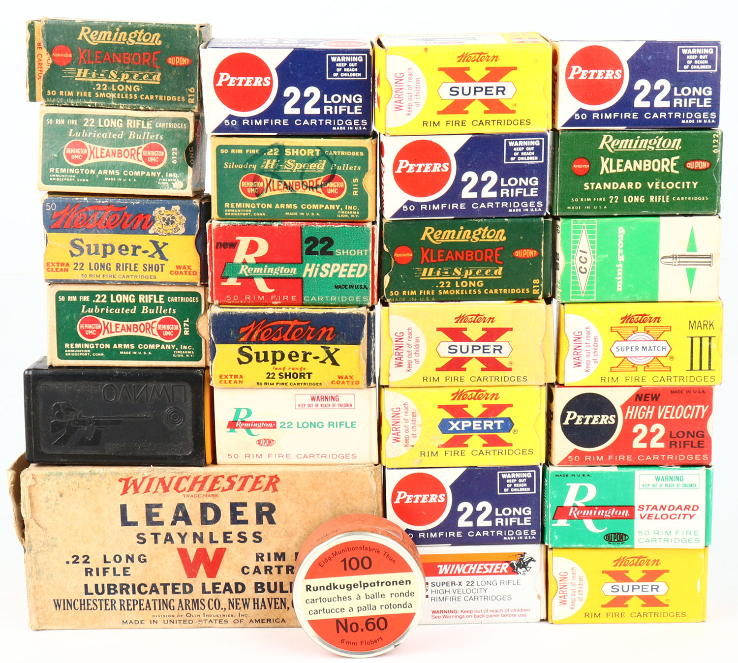 Mixed Mfg. Lot of (26) Empty & partial .22 rim fire boxes. Grade: Very Good ++ - Value: 20 to 40