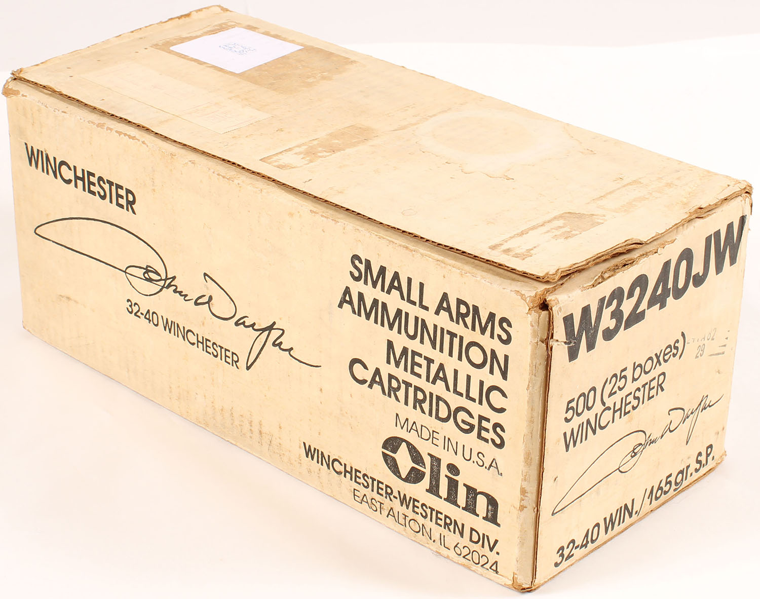 FULL CASE (25 boxes) of Winchester, Oliver F. Winchester, .38-55 Winchester, 255 Grain Soft Point, Full, 1pc. White box picturing Oliver Winchester, boxes are mint & sealed in original shipping box. Grade: Excellent ++ - Value: 2000 to 3000
