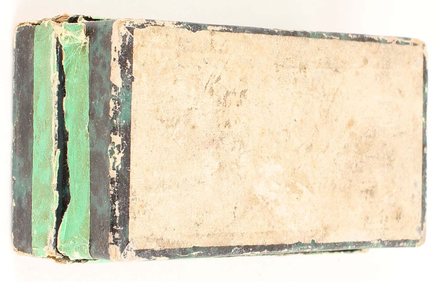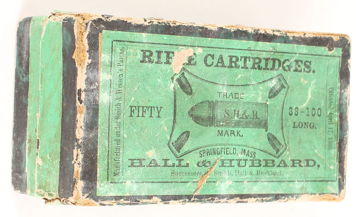 Hall & Hubbard, Rifle Cartridges, .38-100 Long, Partial 4rds. 1pc. Black box with green top & side sealing labels, box is solid with very good color, shelf wear, edge & corner wear, labels are intact, ammo is very good. Grade: Very Good - Value: 100 to 500