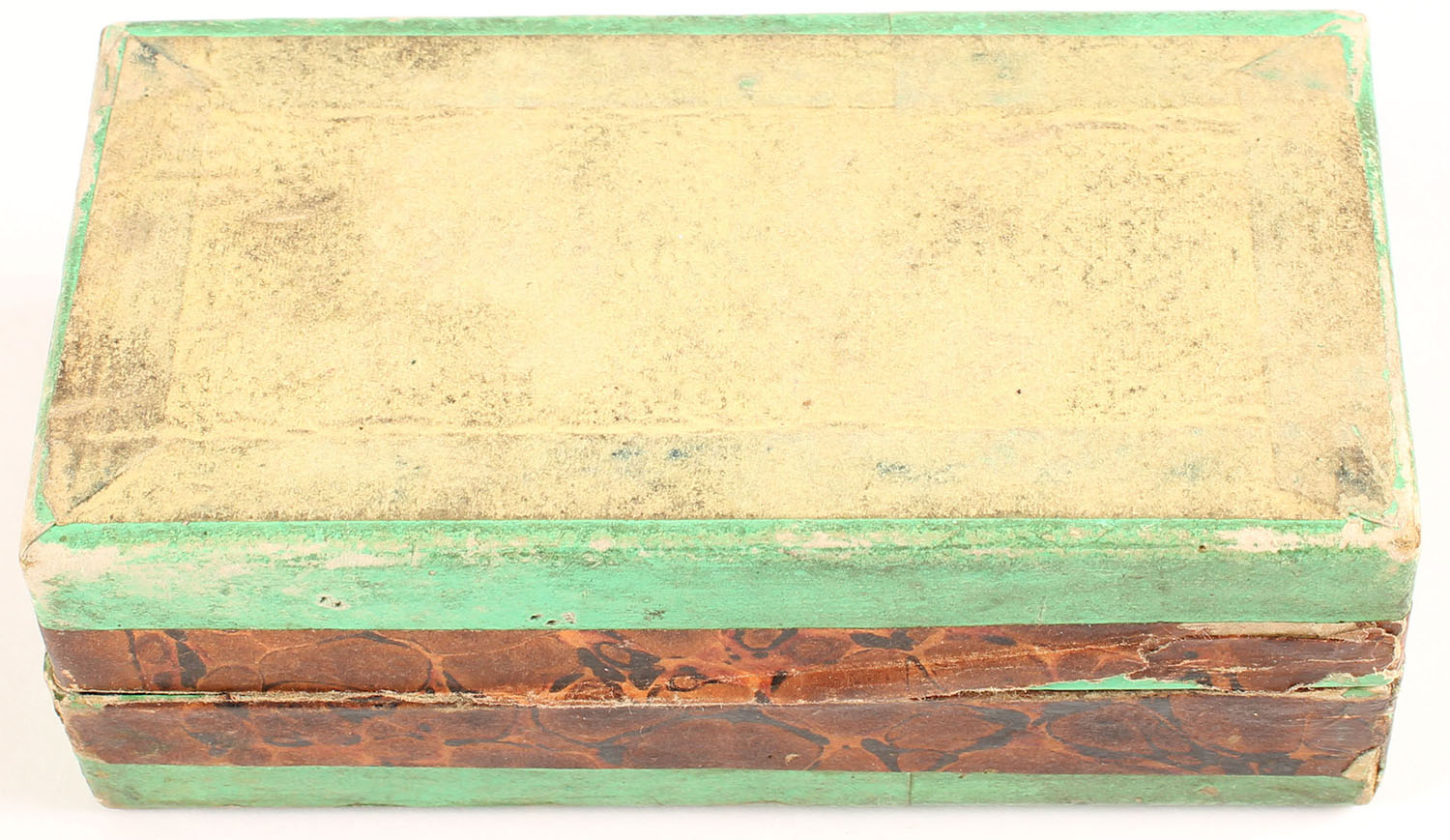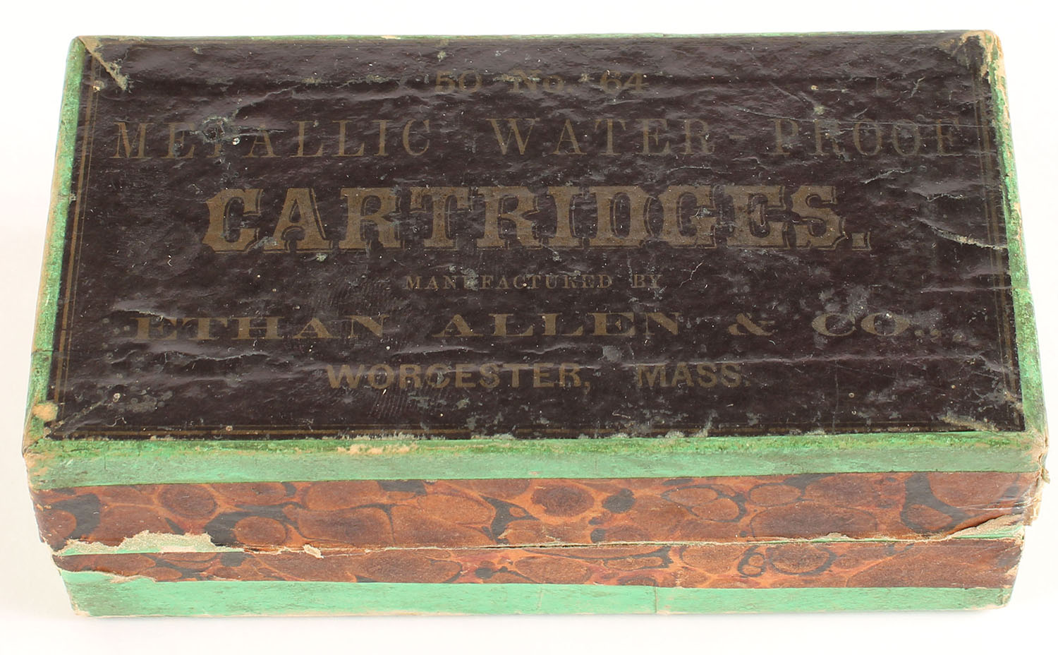 Ethan Allen & Co., Metallic Water Proof Cartridges, .42 Allen & Wheelock No. 64, Partial 1rd. 2pc. Green box with black top label, brown side sealing label, box is solid with excellent color, minor corner wear, very minor edge wear, labels are intact, ammo is excellent. Grade: Excellent + - Value: 500 to 750