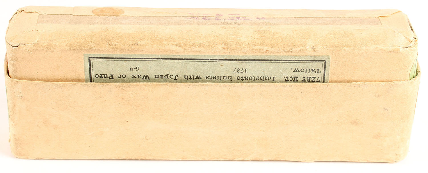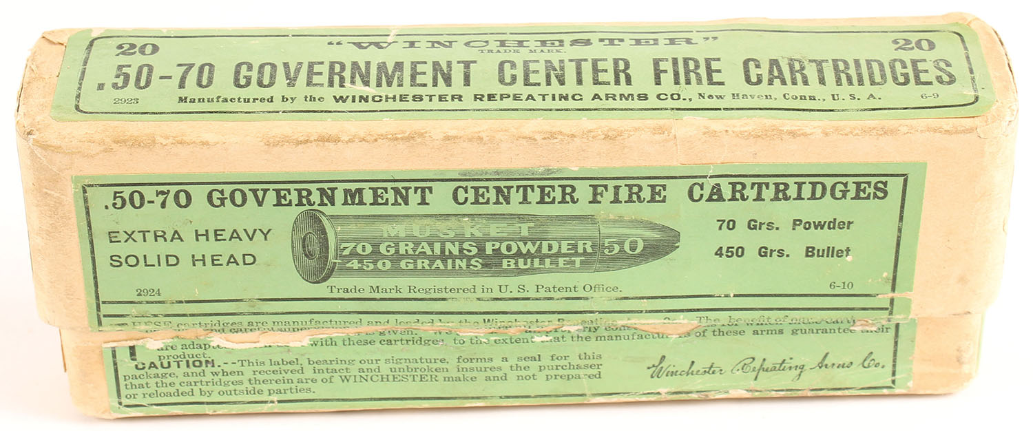 Winchester, Center Fire Cartridges, .50-70 Government, 450 Grs. Extra Heavy Solid Head Bullet, Full, 2pc. Buff box with green labels, box is solid with excellent color, minor shelf wear, minor edge & corner wear, labels are intact, ammo is excellent. Grade: Excellent - Value: 400 to 600