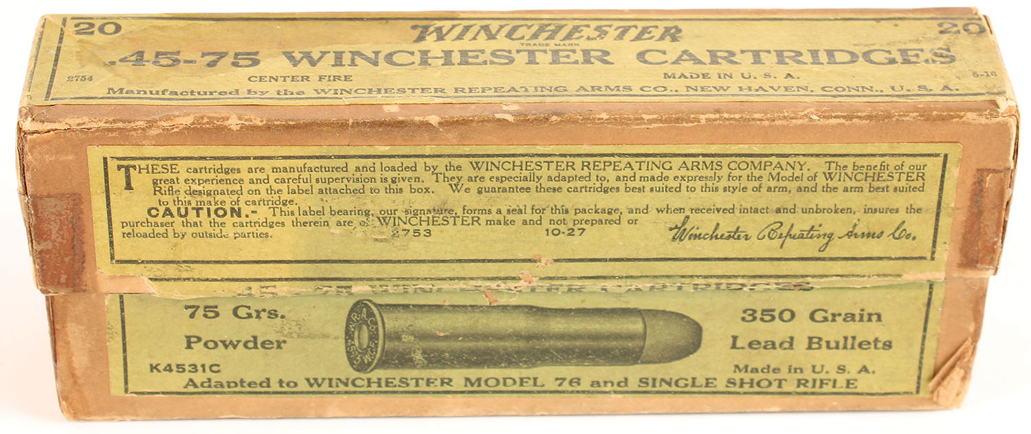 Winchester, Center Fire Cartridges, .45-75 Winchester, 350 Grain Lead Bullets, Full, 2pc. Buff box with green labels, box is solid with very good color, some age soiling, stain on top, tape on both ends of lid, some corner wear, minor edge wear, labels are intact, ammo is excellent. Grade: Very Good + - Value: 150 to 225