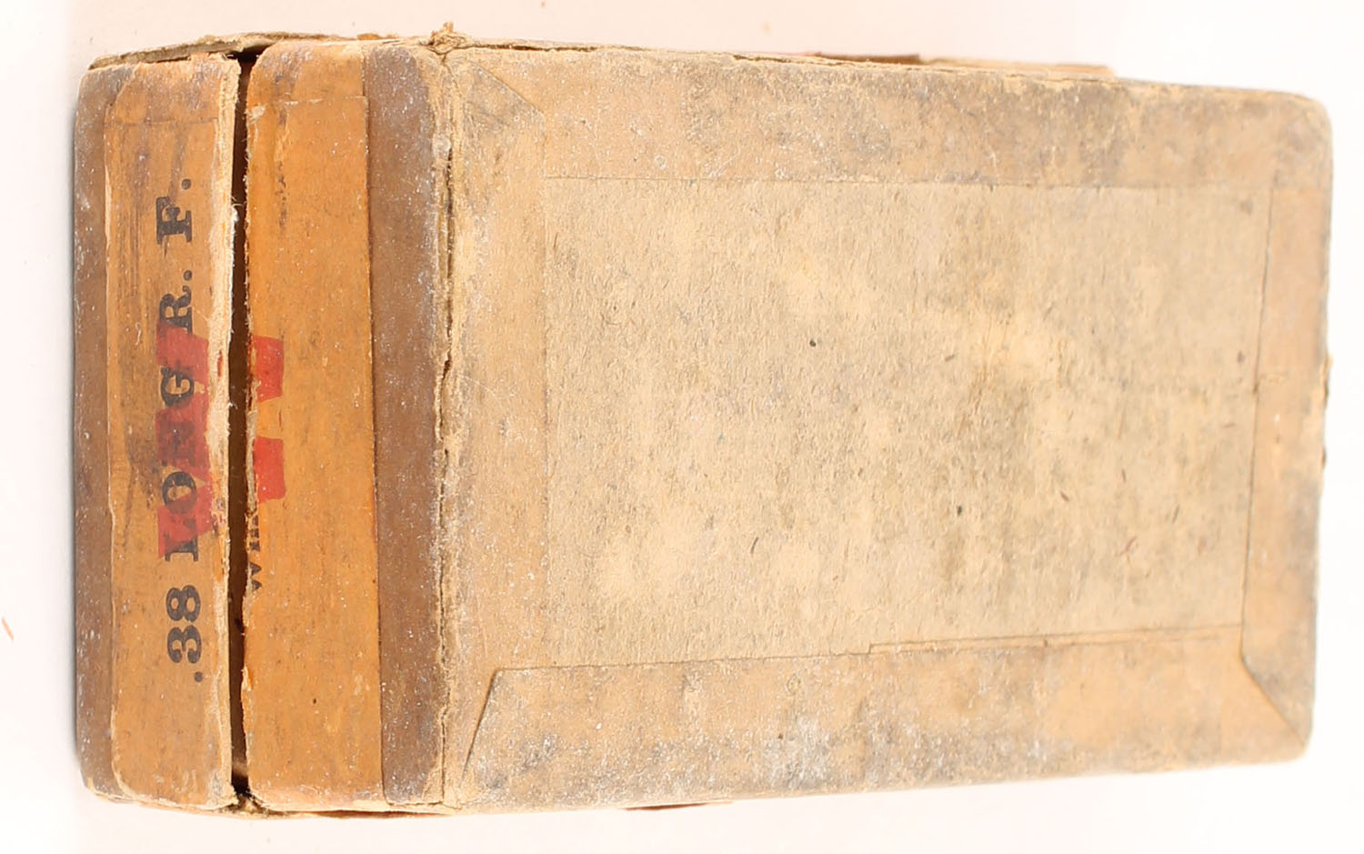 Winchester, Rifle Cartridges, .38 Long Rim Fire, Oct. 24 Patent Date, Full, 2pc. Buff box with green top & orange side sealing labels, with insert, seam splits to left edge & back left corner of lid, Very Good color, some age soiling & shelf wear, edge & corner wear, labels are intact, ammo is very good. Grade: Good + - Value: 30 to 45