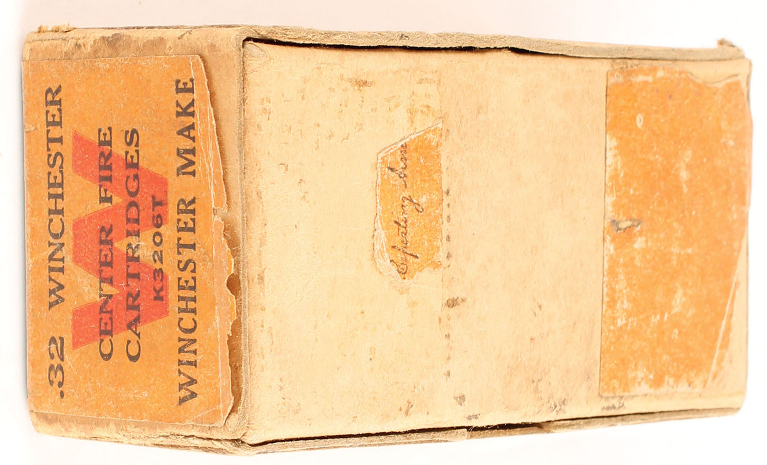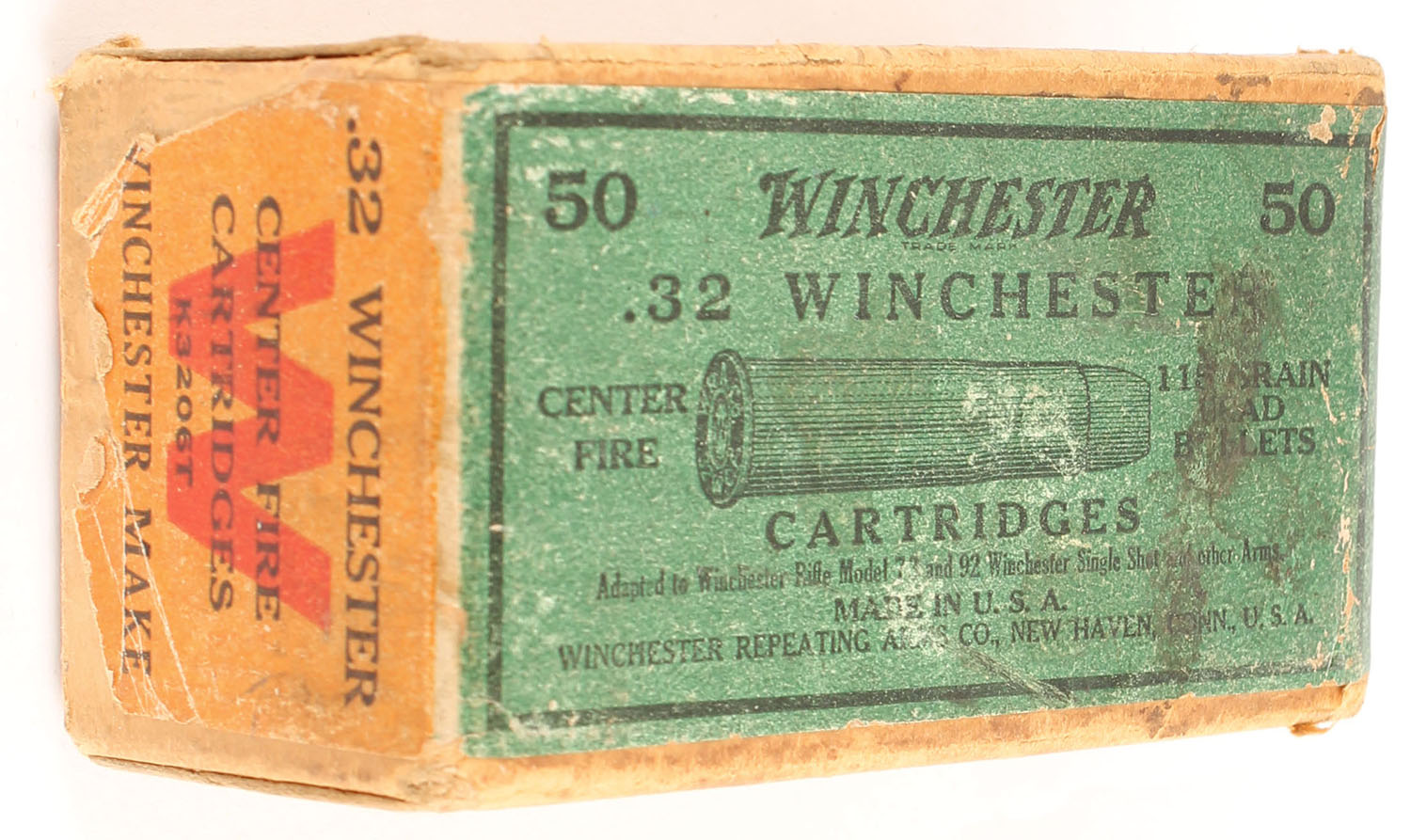 Winchester, Center Fire Cartridges, .32 Winchester, 115 Grain Lead Bullets, Partial 25rds. Correct, 2pc. Buff box with green & orange wraparound label, box is solid with very good color, some age soiling, stain on top, some shelf & corner wear, minor edge wear, label is intact, ammo is very good. Grade: Very Good - Value: 40 to 60