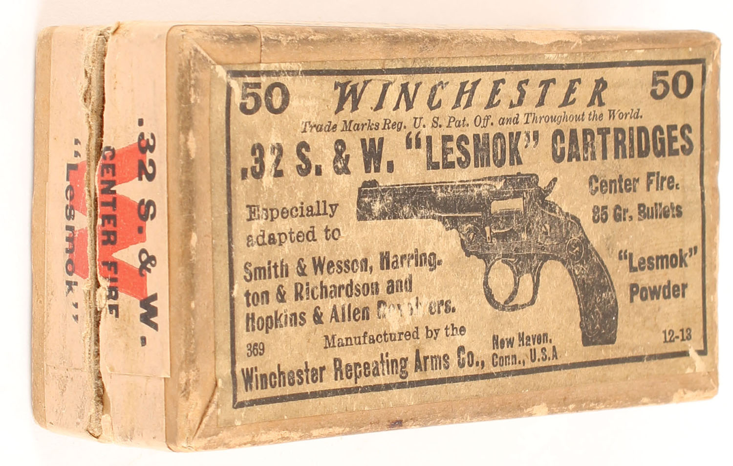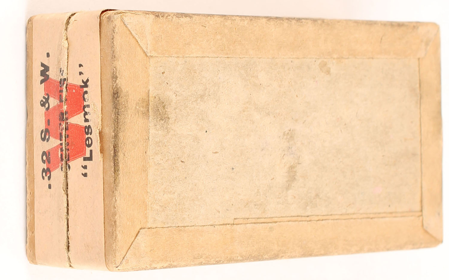 Winchester, ''Lesmok'' Cartridges, .32 Smith & Wesson, 85 Gr. Bullets, Partial 26rds. 2pc. Buff box with green top & white side sealing labels, box is solid with good color, some age soiling & color fading, minor shelf & corner wear, very minor edge wear, labels are intact, ammo is very good. Grade: Very Good - Value: 20 to 30