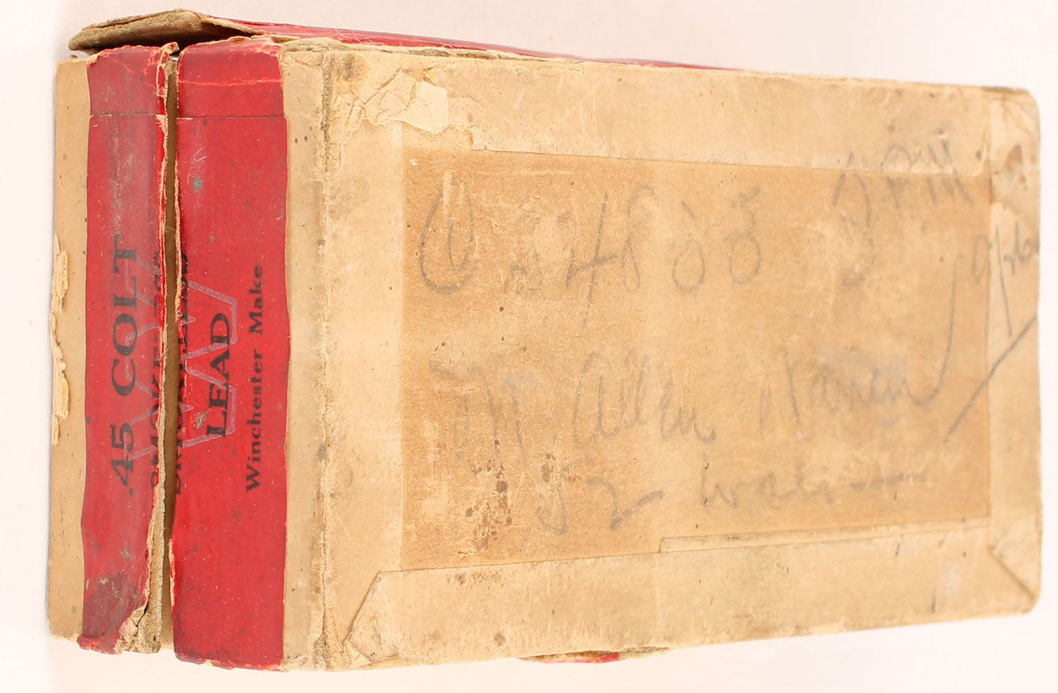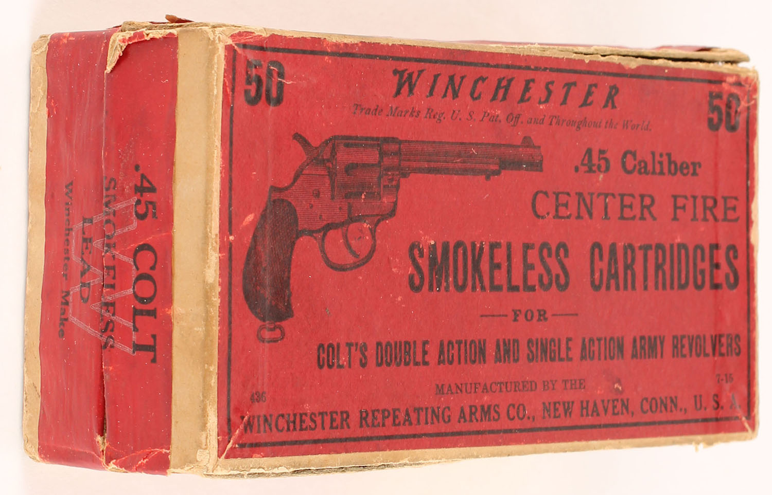 Winchester, Smokeless Cartridges, .45 Colt, Empty, 2pc. Buff box with red top & side sealing labels, box is missing front side of lid, missing half of front shell of box, excellent color, minor edge & corner wear, side sealing label is 80% intact. Grade: Good ++ - Value: 24 to 36