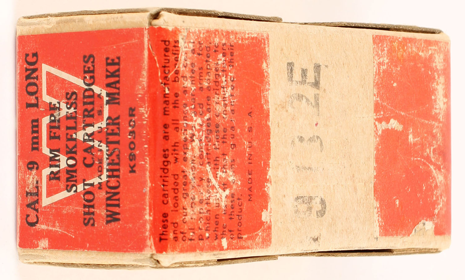 Winchester, 9mm Long Shot Cartridges, Rim Fire, FULL & SEALED, 2pc. Buff box with red wraparound label, box is solid with excellent color, some shelf wear, very minor corner wear, edges are mostly crisp, label is intact. Grade: Excellent + - Value: 150 to 225