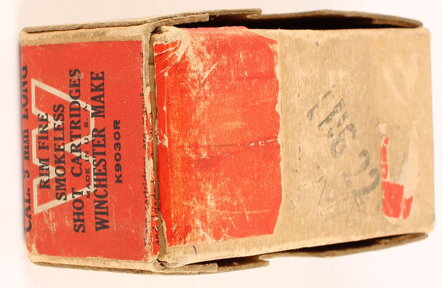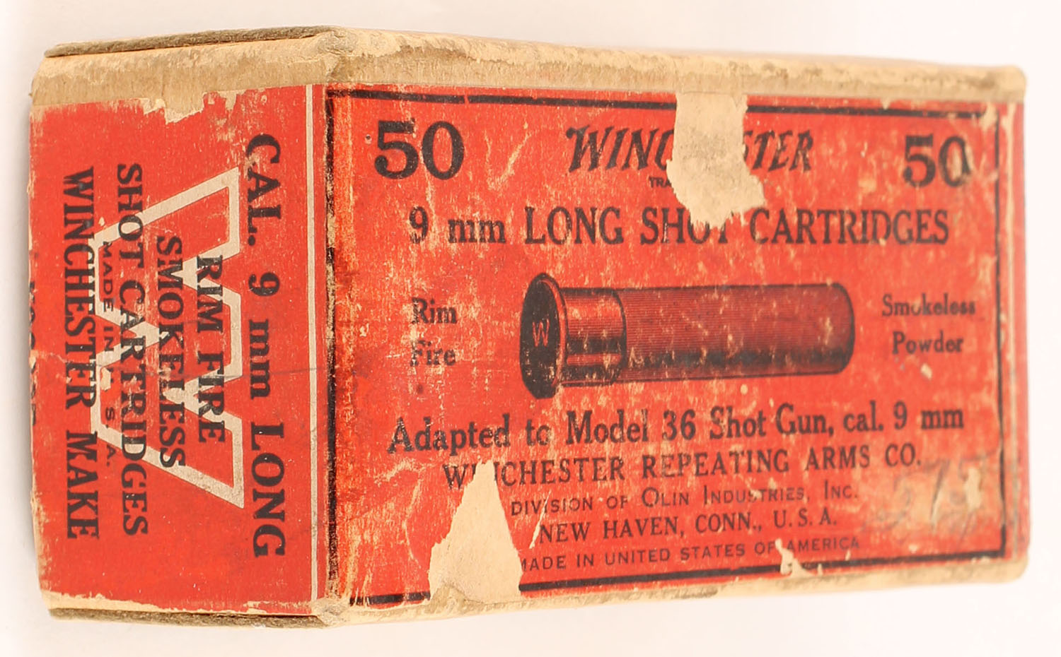 Winchester, 9mm Long Shot Cartridges, Rim Fire, Partial 26rds, 2pc. Buff box with red wraparound label, box is solid with very good color, shelf wear, some scuffing to top, some corner wear, minor edge wear, top has been written on, label is intact, ammo is excellent. Grade: Very Good - Value: 50 to 75