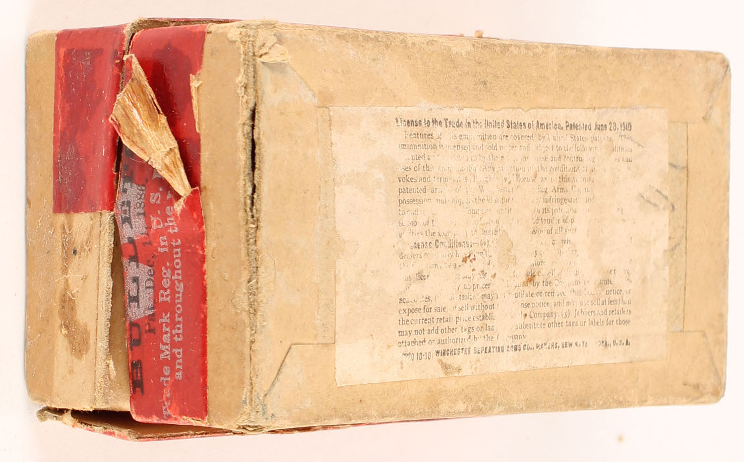 Winchester, Smokeless Cartridges, .32 Winchester, Metal Patched Bullets, Partial 37rds. 2pc. Buff box with red top & side sealing labels, box is solid with very good color, some age soiling, vertical seam split to front right corner of lid, some corner wear, minor edge wear, side sealing label is 95% intact, ammo is excellent. Grade: Very Good + - Value: 40 to 60