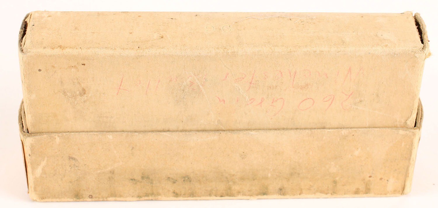 Winchester, Staynless, .40-82 Winchester, Smokeless, 260 Grain Soft Point Bullets, Full, 2pc. Buff box with orange labels, box is solid with very good to excellent color, minor age soiling, tape on left end of lid, some edge & corner wear, labels are intact, ammo is excellent. Grade: Very Good ++ - Value: 200 to 300