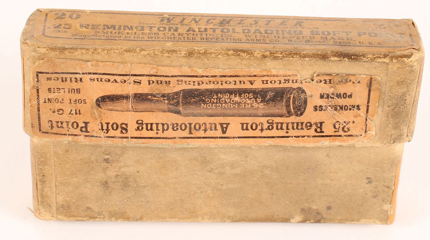 Winchester, Smokeless Cartridges, .25 Remington Autoloading, 117 Gr. Soft Point Bullets, Partial 10rds. Correct, 2pc. Buff box with orange labels, box is solid with good color, age soiling, some color fading, some edge & corner wear, labels are intact, ammo is excellent. Grade: Very Good - Value: 16 to 24