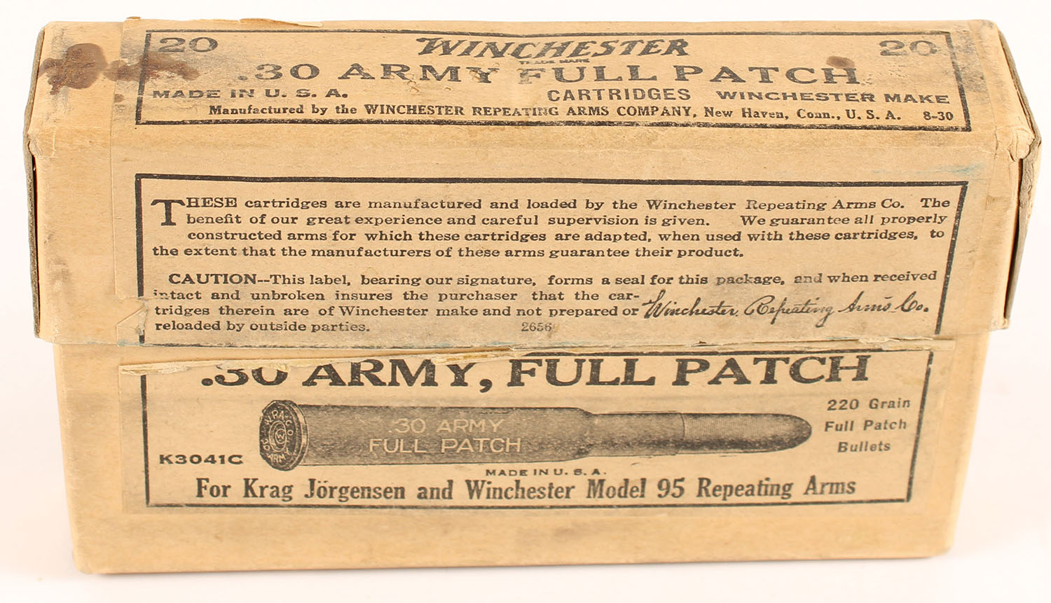 Winchester, Cartridges, .30 Army (.30-40 Krag), 220 Grain Full Patch Bullets, Partial 14rds., 2pc. Buff box with buff labels, box is solid with very good to excellent color, some staining & corner wear, minor edge wear, labels are intact, ammo is fair. Grade: Very Good + - Value: 8 to 12