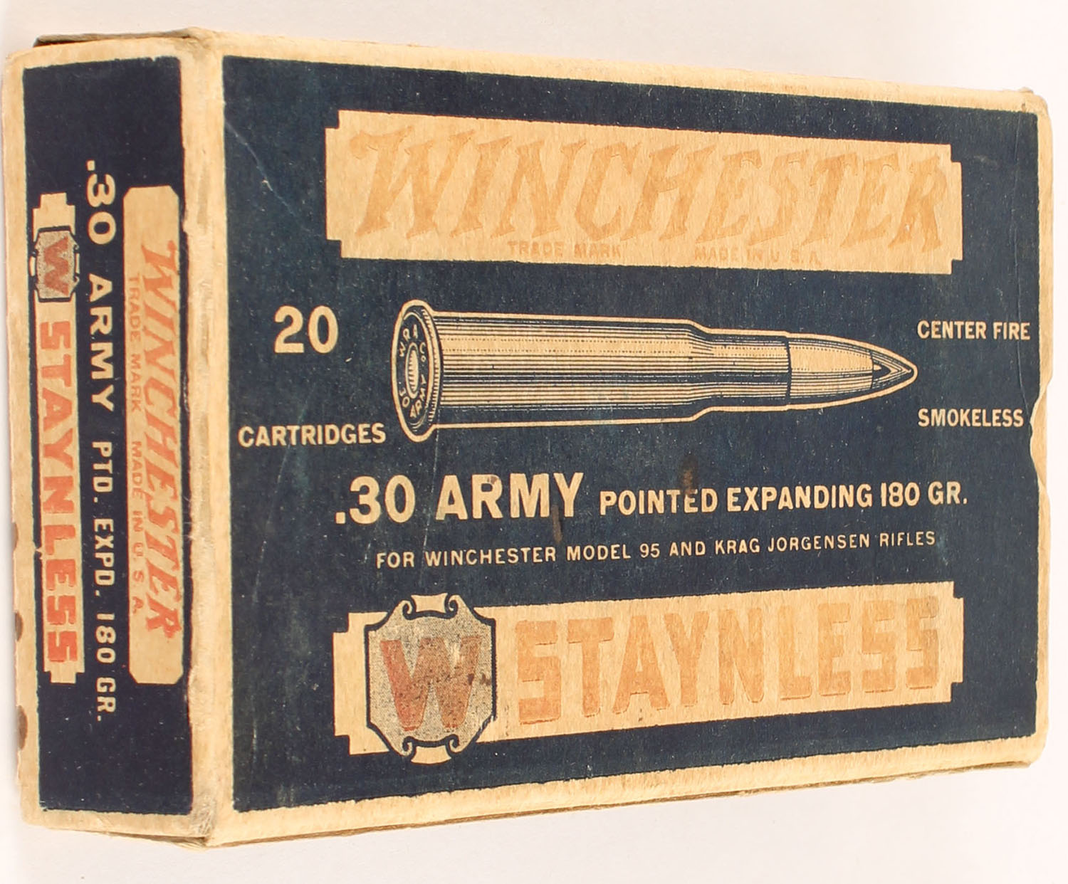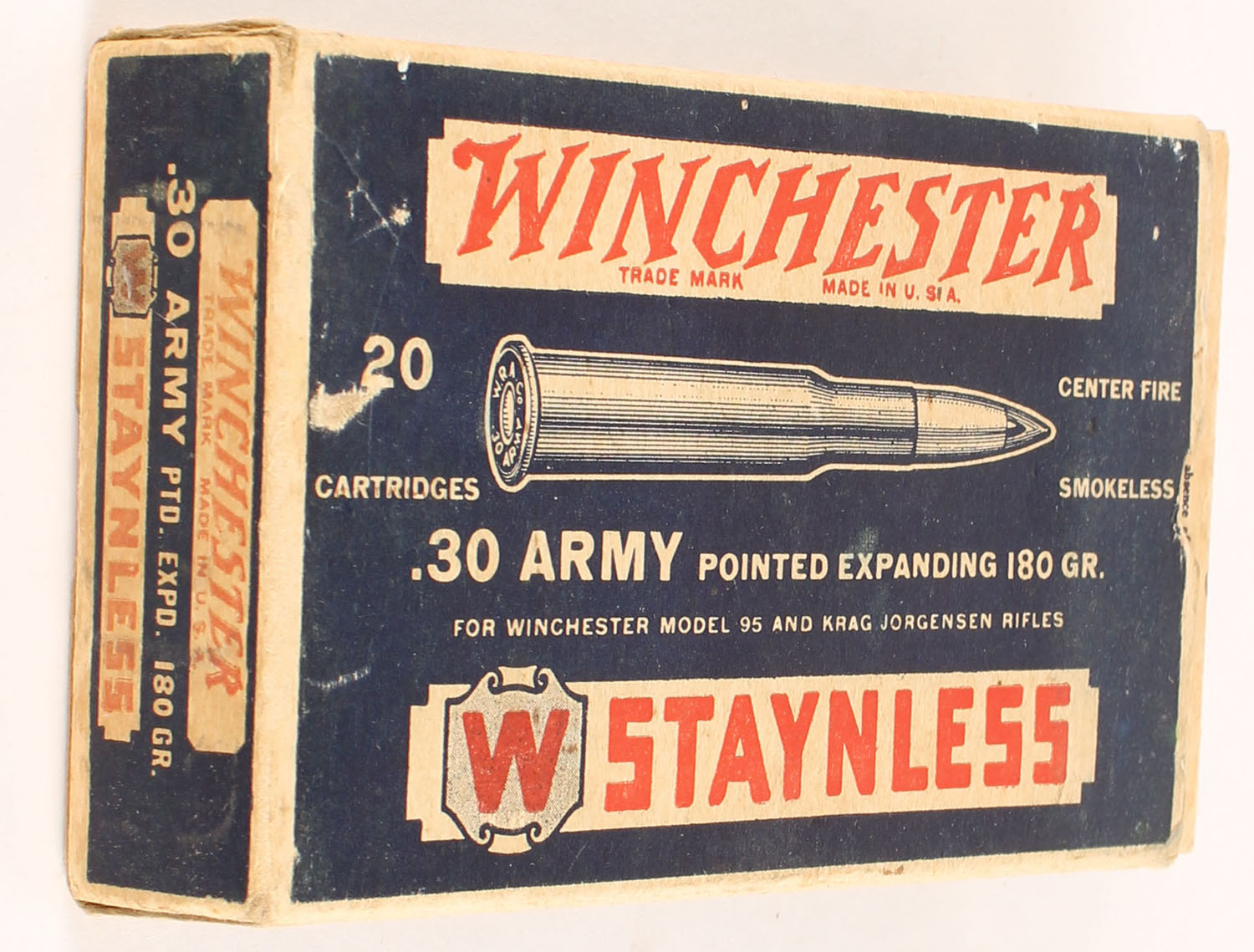 Winchester, Staynless, .30 Army (.30-40 Krag), 180 Gr. Pointed Expanding Bullet, Partial 14rds., 1pc. Blue white & red box, box is solid with good color, minor age soiling, color fading to red ink, minor corner wear, edges are mostly crisp, end flaps are solid, ammo is excellent. Grade: Very Good + - Value: 24 to 36