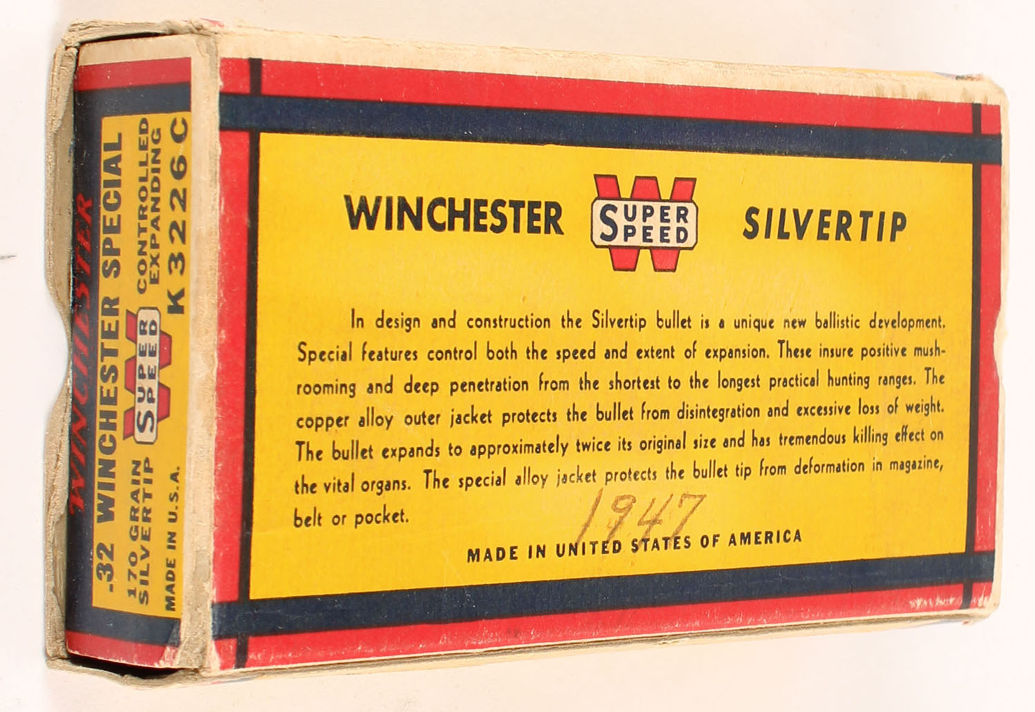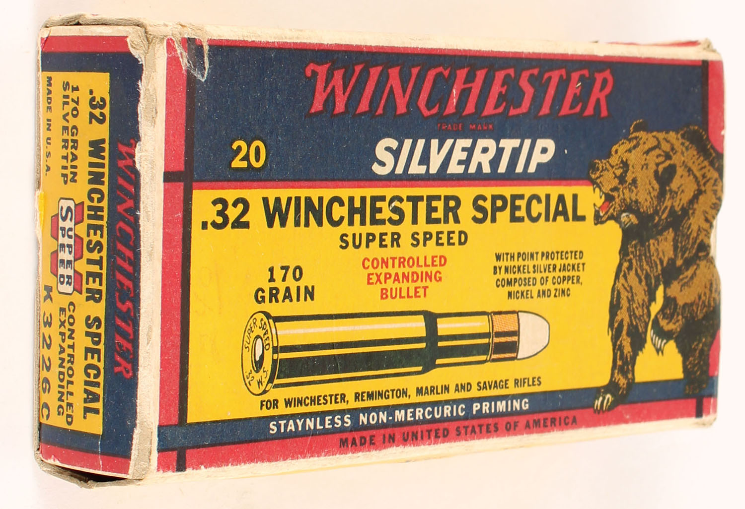 Winchester, Silvertip, .32 Winchester Special, 170 Grain Controlled Expanding Bullet, Full, 1pc. Yellow blue & red bear box, box is solid with excellent color, some corner wear, edges are mostly crisp, crease on front side, end flaps are solid, ammo is excellent. Grade: Excellent + - Value: 80 to 120
