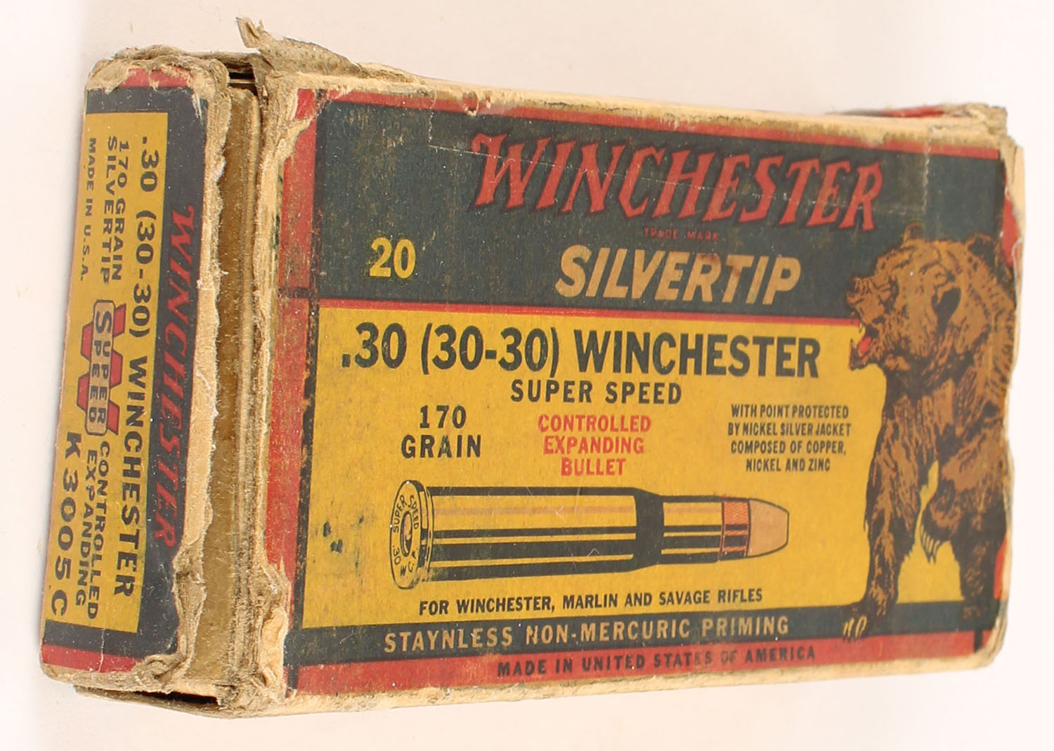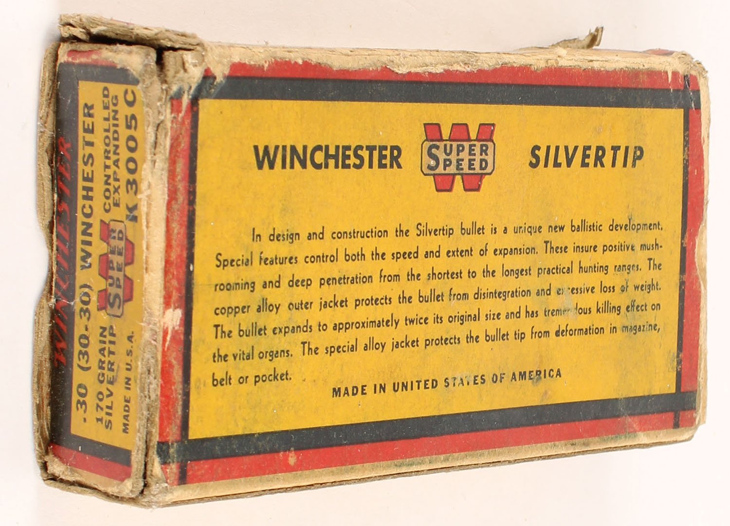 Winchester, Silvertip, .30 Winchester (.30-30), 170 Grain Controlled Expanding Bullet, Partial 18rds. Correct, 1pc. Yellow blue & red bear box, left end flap is torn, good to very good color, age soiling, edge & corner wear, right end flap is solid, ammo is excellent. Grade: Good ++ - Value: 30 to 45
