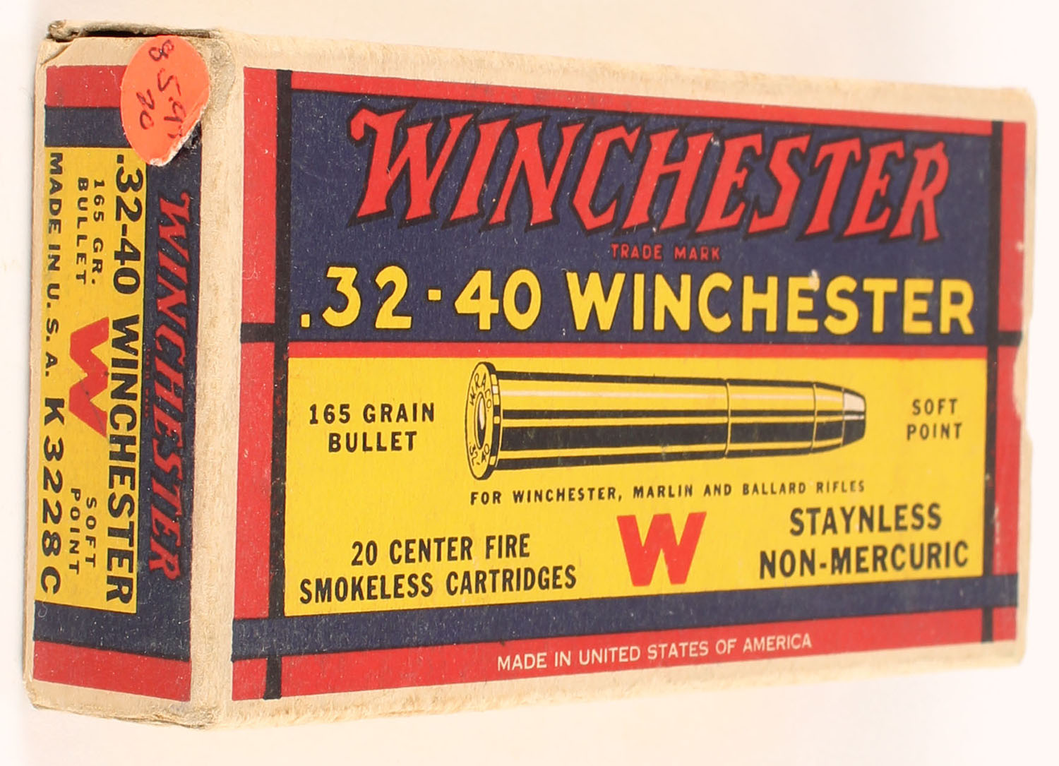 Winchester, Smokeless Cartridges, .32-40 Winchester, 165 Grain Soft Point Bullet, Full, 1pc. Yellow blue & red box, box is solid with excellent color, some corner wear, sticker on left end, very minor edge wear, end flaps are solid, ammo is excellent. Grade: Excellent - Value: 100 to 150