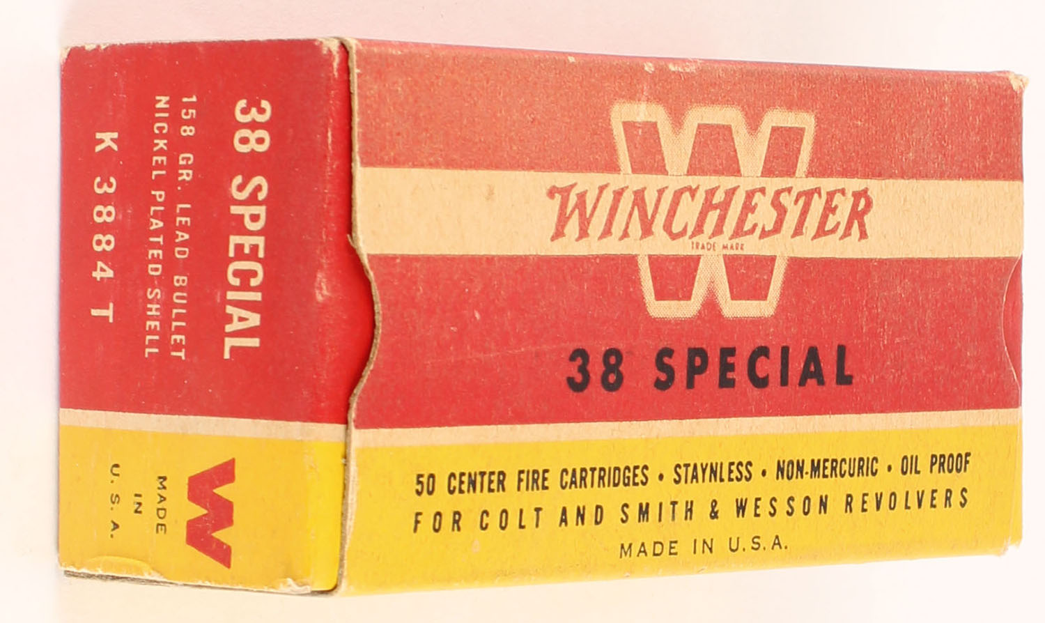 Winchester, Center Fire Cartridges, .38 Special, 158 Grain Lead Bullet, Nickel Plated Shell, Full, 1pc. Red yellow & white box, box is solid with very good color, minor age soiling & color fading, very minor corner wear, edges are crisp, end flaps are solid, ammo is excellent. Grade: Excellent - Value: 36 to 54