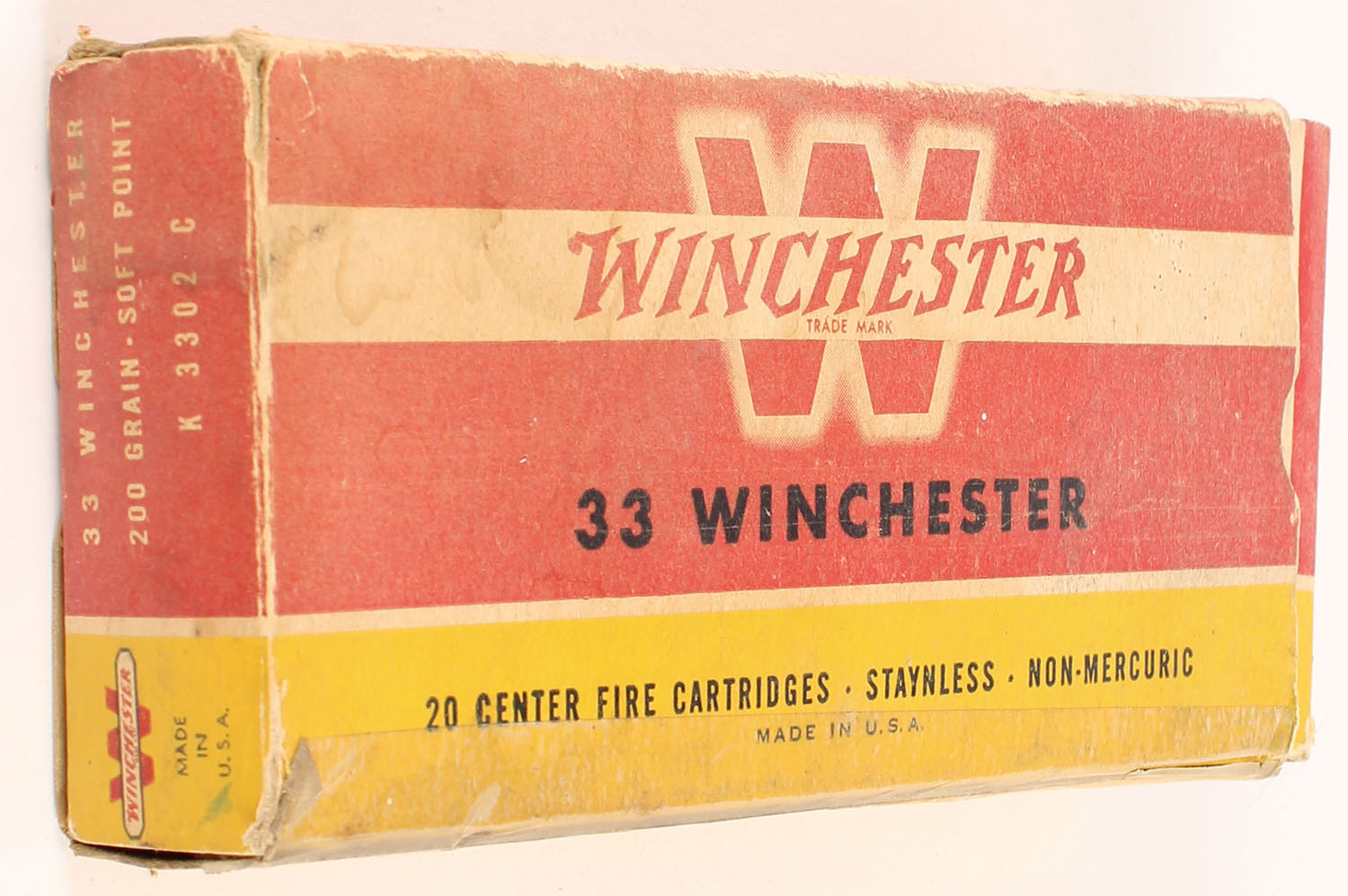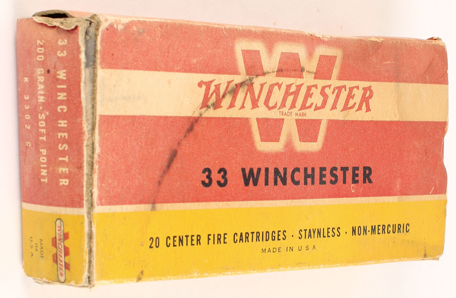 Winchester, Center Fire Cartridges, .33 Winchester, 200 Grain Soft Point, Full, 1pc. Red yellow & white box, left end flap is torn & taped, factory seam is taped, good color, age soiling & color fading, stain on top, some corner wear, minor edge wear, right end flap is solid, ammo is excellent. Grade: Very Good - Value: 80 to 120