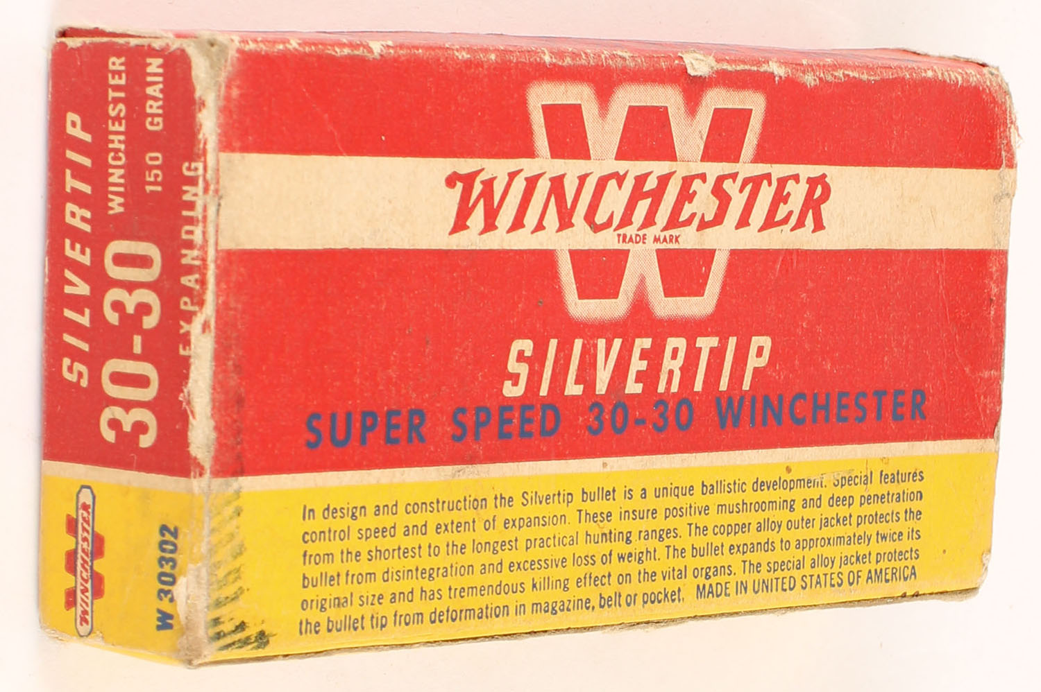 Winchester, Silvertip, .30-30 Winchester, 150 Grain Controlled Expanding Bullet, Full of incorrect ammo, 1pc. Red yellow & white box, missing left end flap, very good color, some age soiling & corner wear, minor edge wear, right end flap is solid, ammo is excellent. Grade: Good ++ - Value: 16 to 24