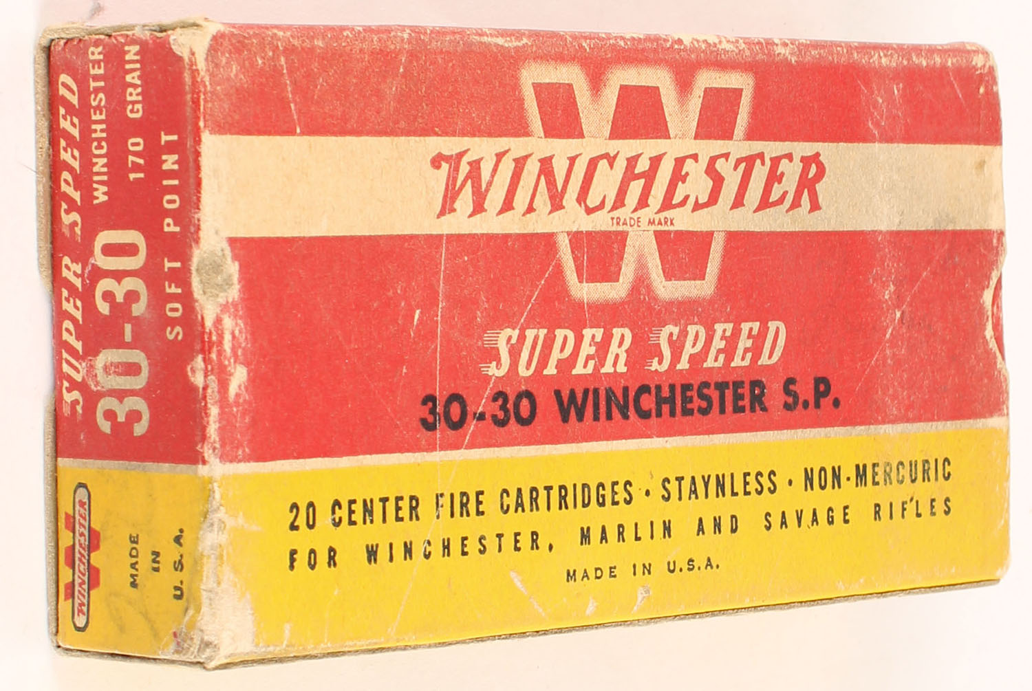 Winchester, Super Speed, .30-30 Winchester, 170 Grain Soft Point Bullet, Full, 1pc. Red yellow & white box, box is solid with good color, color fading on top, staining on front, some edge & corner wear, end flaps are solid, ammo is excellent. Grade: Very Good - Value: 20 to 30
