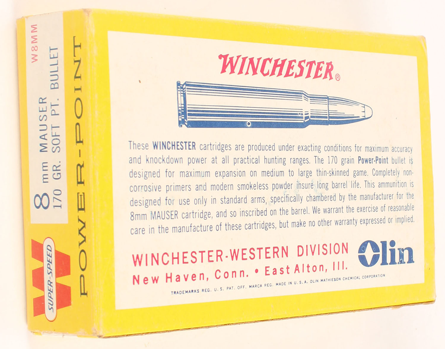 Winchester, Power-Point, 8mm Mauser, 170 Grain Soft Point Bullet, Full, 1pc. Yellow white & red box, box is solid with very good color, some color fading on top, sticker residue on top, very minor corner wear, edges are crisp, end flaps are solid, ammo is excellent. Grade: Excellent - Value: 20 to 30
