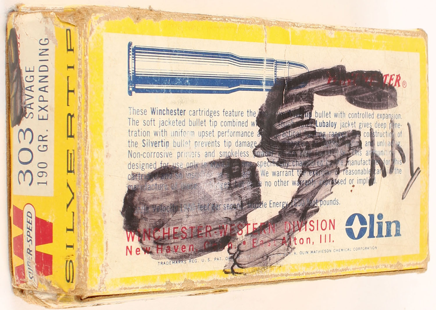 Winchester, Silvertip, .303 Savage, 190 Grain Expanding Bullet, Full (18 correct rds., 2 rds. Have correct H/S but are soft point bullets), 1pc. Yellow white & red box, box is solid with very good color, some shelf wear, right side and bottom have been written on, corner wear, some edge wear, end flaps are solid, ammo is excellent. Grade: Very Good - Value: 30 to 45