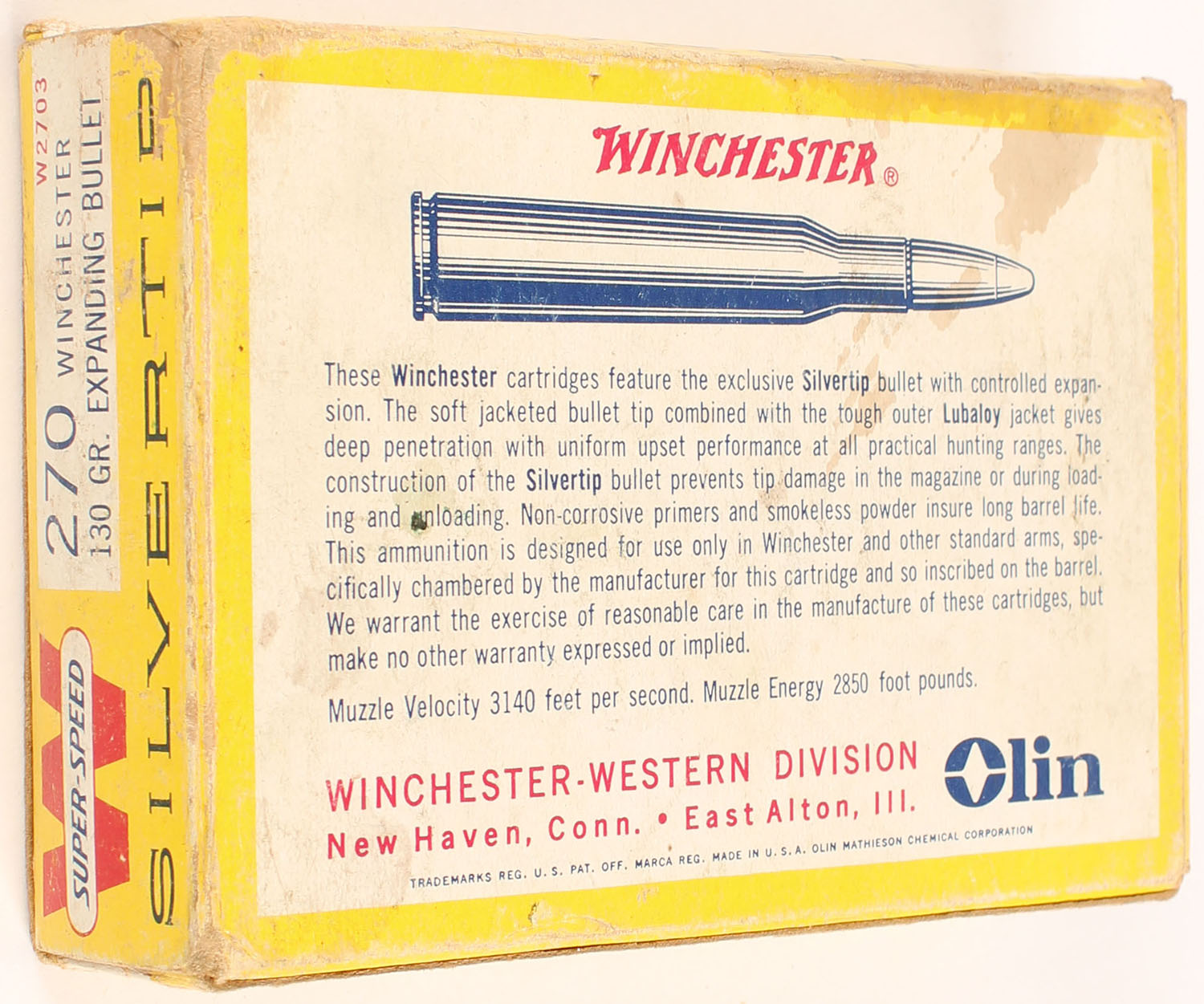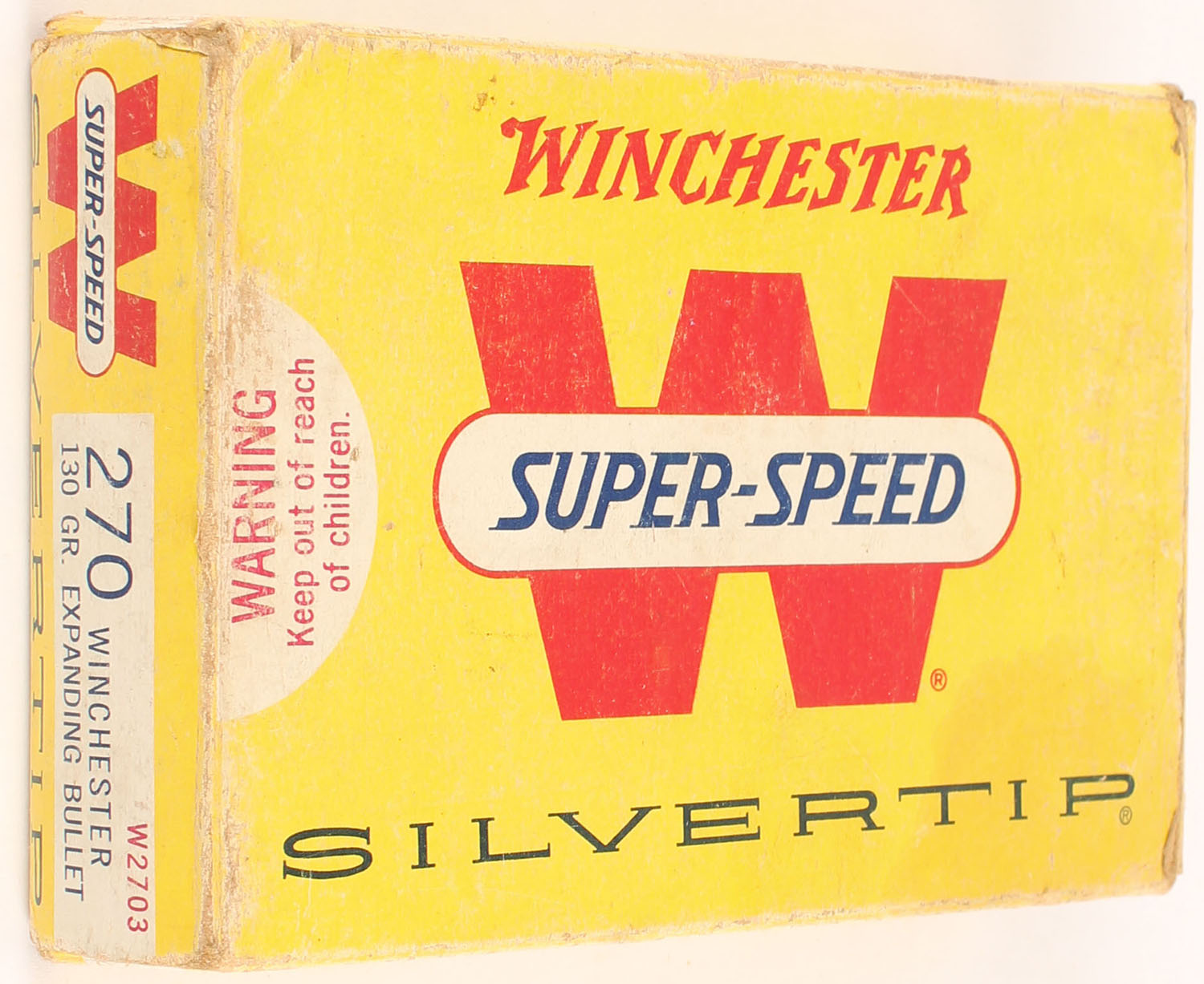 Winchester, Silvertip, .270 Winchester, 130 Grain Expanding Bullet, Full, 1pc. Yellow white & red box, box is solid with very good to excellent color, some shelf wear, stain on top/front corner of box, some edge & corner wear, end flaps are solid, ammo is excellent. Grade: Very Good ++ - Value: 24 to 36