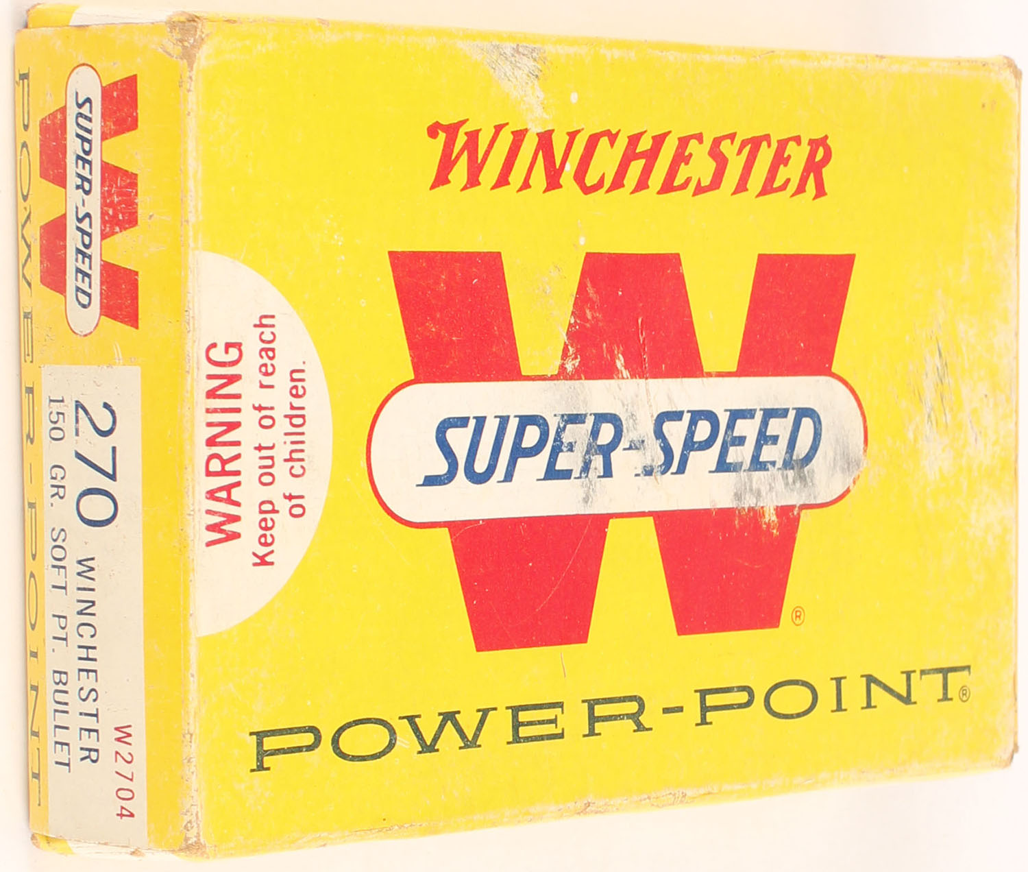 Winchester, Power-Point, .270 Winchester, 150 Grain Soft Point Bullet, Full, 1pc. Yellow white & red box, box is solid with excellent color, shelf wear, minor edge & corner wear, end flaps are solid, ammo is excellent. Grade: Very Good ++ - Value: 20 to 30