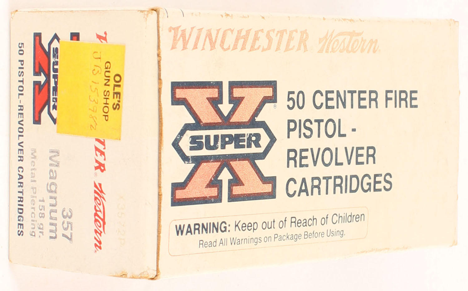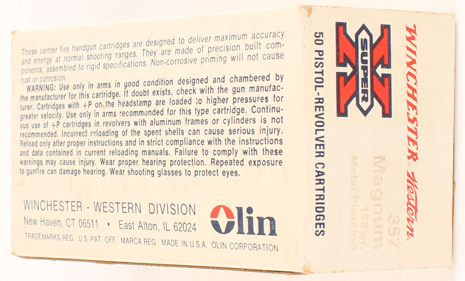 Winchester-Western, Super X, .357 Magnum, 158 Grain Metal Piercing Bullet, Full, 1pc. White red & black box, box is solid with very good color, some color fading, minor corner wear, edges are crisp, end flaps are solid, ammo is excellent. Grade: Excellent - Value: 30 to 45