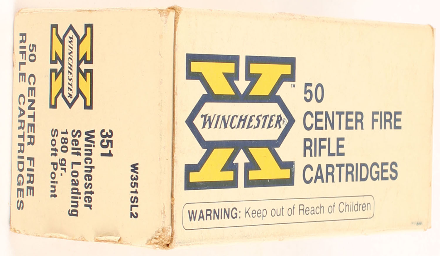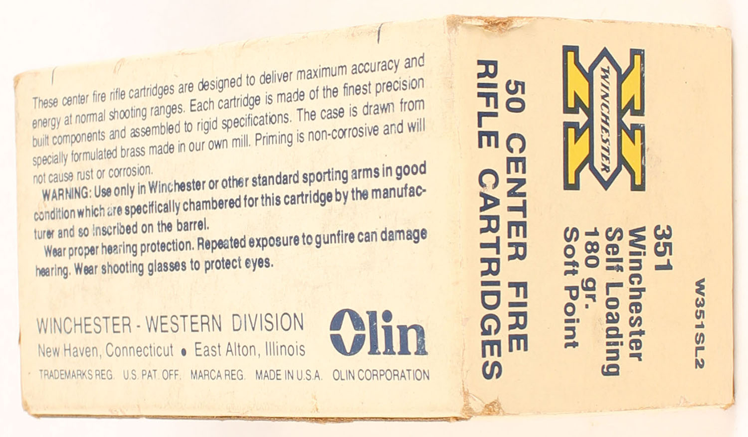 Winchester, X, .351 Winchester Self Loading, 180 Grain Soft Point, Full, 1pc. White black & yellow box, box is solid with very good color, minor age soiling & corner wear, very minor edge wear, end flaps are solid, ammo is excellent. Grade: Very Good ++ - Value: 100 to 150