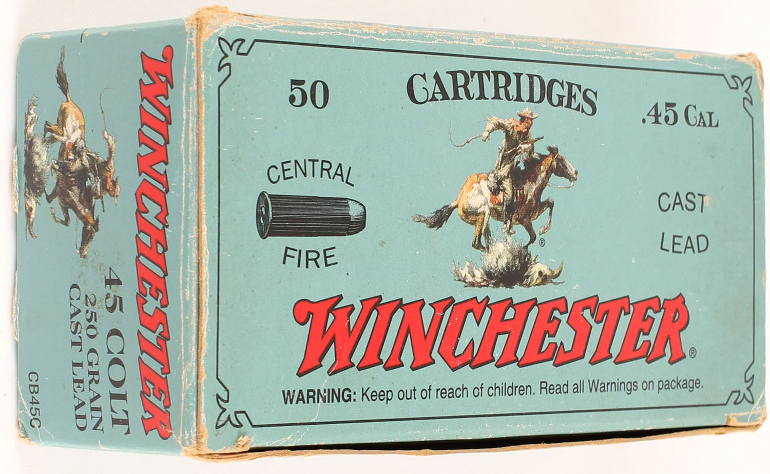 Winchester, Cowboy Action Loads, .45 Colt, 250 Grain Cast Lead, Full, 1pc blue & red box, box is solid with excellent to minty color, minor shelf & corner wear, very minor edge wear, top flap is solid, ammo is minty. Grade: Excellent + - Value: 60 to 80