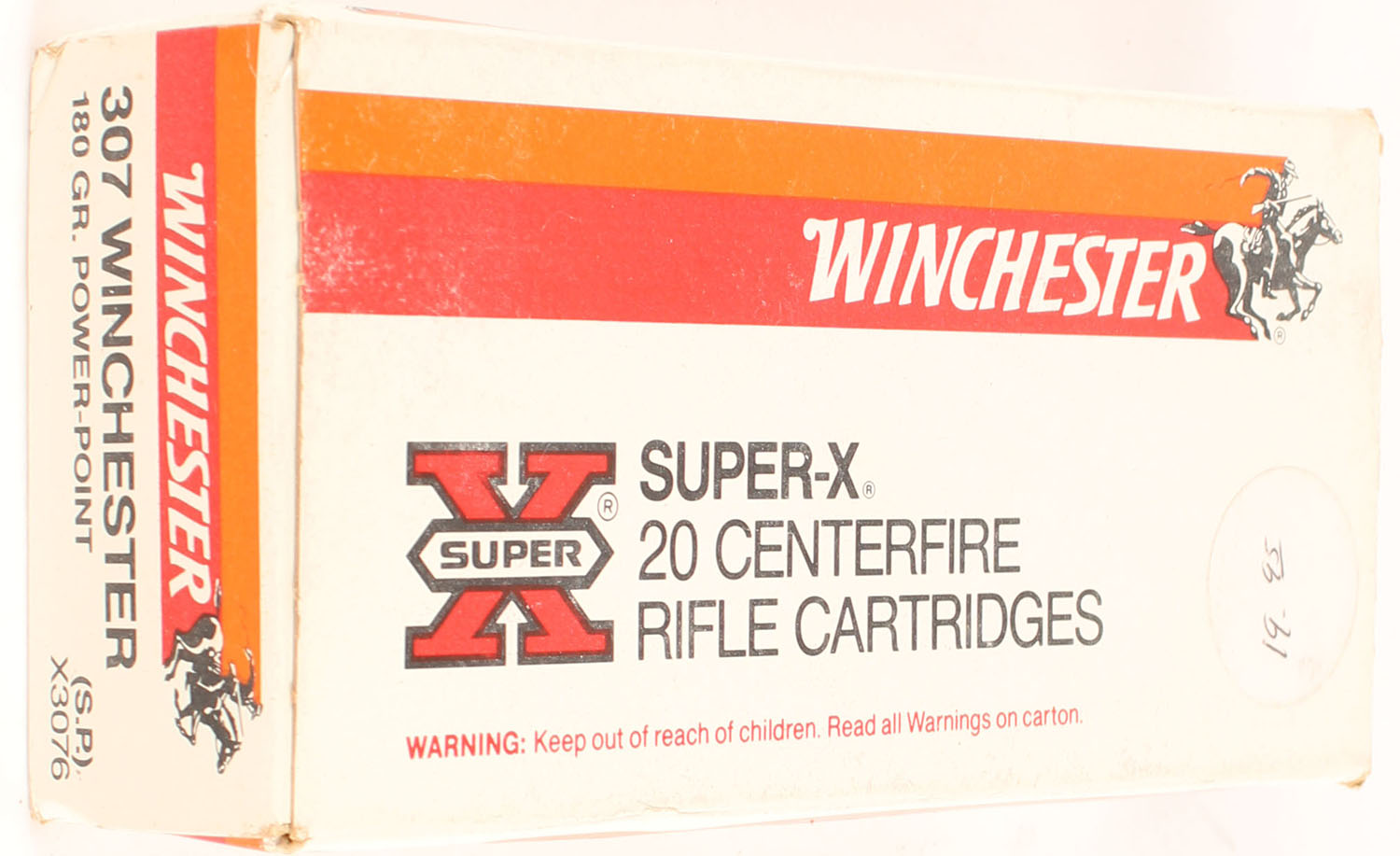 Winchester, Super-X, .307 Winchester, 180 Grain Power-Point, Full, 1pc. White red & orange box, box is solid with excellent color, some corner wear, edges are mostly crisp, sticker on top, end flaps are solid, ammo is excellent to minty. Grade: Excellent + - Value: 40 to 60