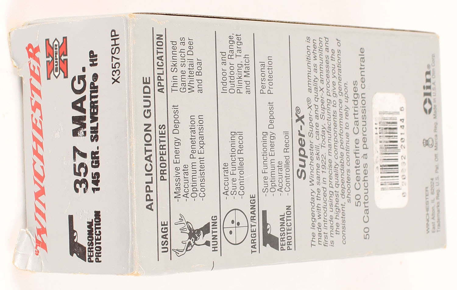 Winchester, Super X, .357 Magnum, 145 Grain Silvertip Hollow Point, Full (39rds. Correct, 11rds. Incorrect), 1pc. Silver & red box, box is solid with excellent to minty color, very minor shelf & corner wear, edges are crisp, end flaps are solid, ammo is excellent. Grade: Excellent + - Value: 36 to 54