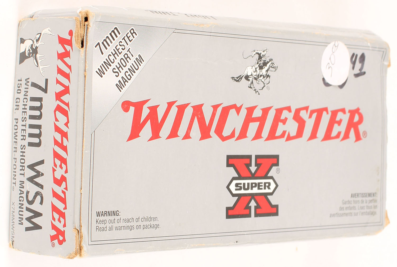 Winchester, Super X, 7mm WSM, 150 Grain Power-Point, Full, 1pc. Silver & red box, box is solid with excellent color, crease on top, some corner wear, very minor edge wear, end flaps are solid, ammo is excellent. Grade: Excellent - Value: 50 to 75