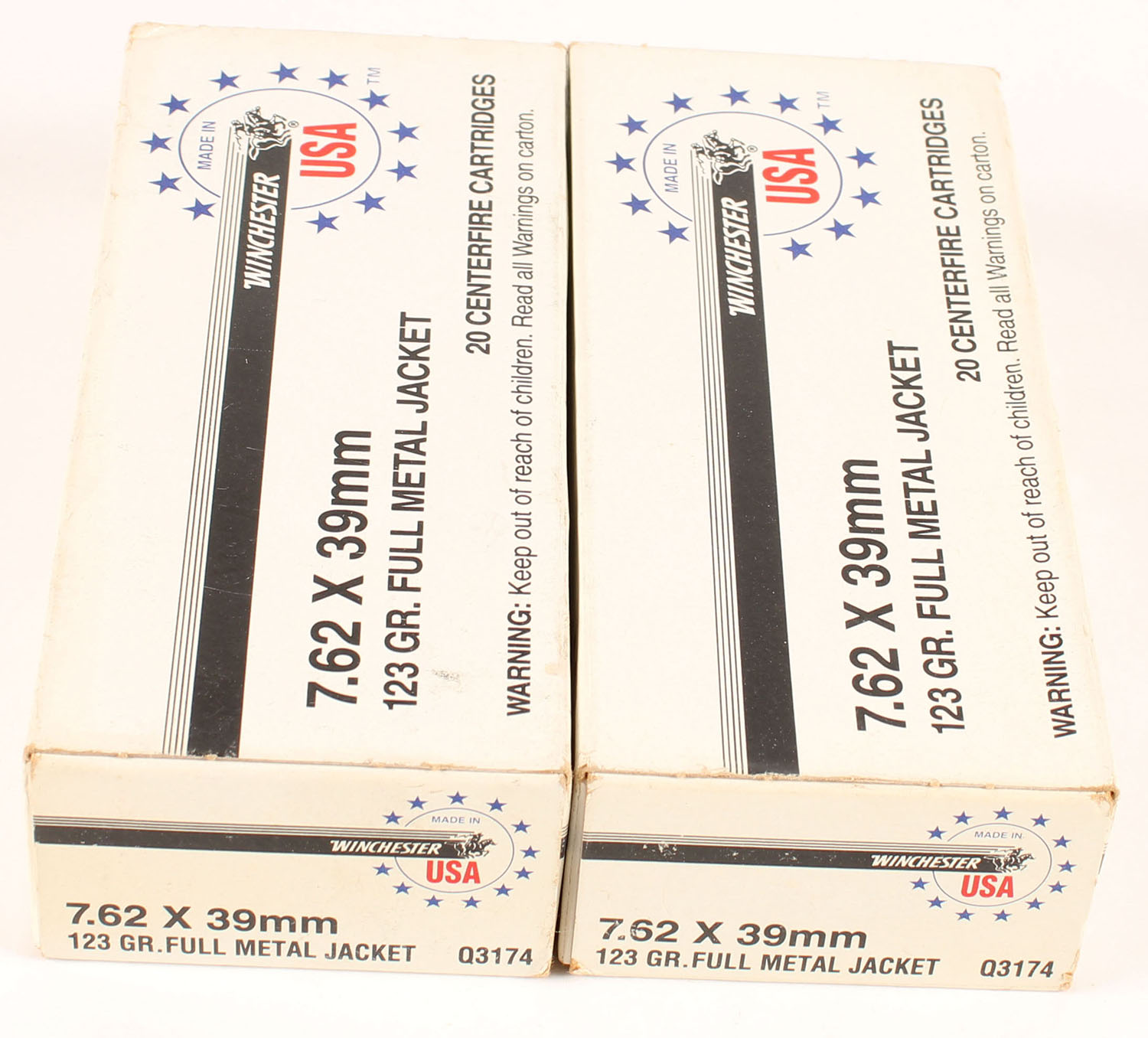 Winchester, Lot of (2), USA, 7.62 x 39mm, 123 Grain Full Metal Jacket, both boxes are full, solid with minty color, very minor corner wear, edges are crisp, end flaps are solid, ammo is minty. Grade: Excellent ++ - Value: 20 to 30