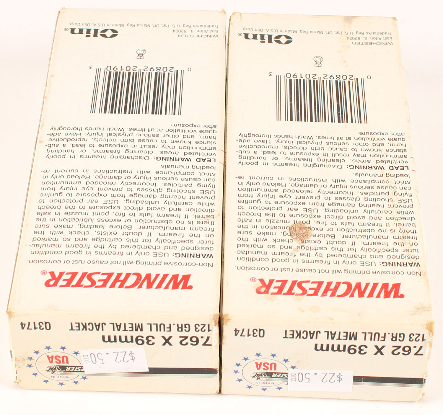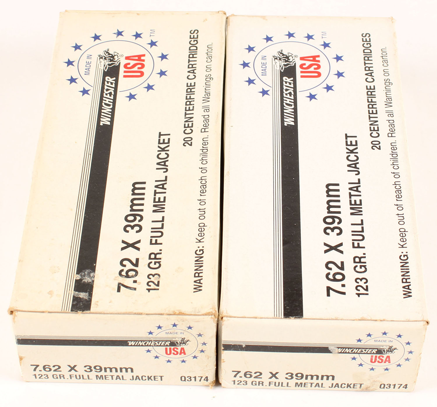 Winchester, Lot of (2), USA, 7.62 x 39mm, 123 Grain Full Metal Jacket, both boxes are full, solid with minty color, very minor corner wear, edges are crisp, end flaps are solid, ammo is minty. Grade: Excellent ++ - Value: 20 to 30