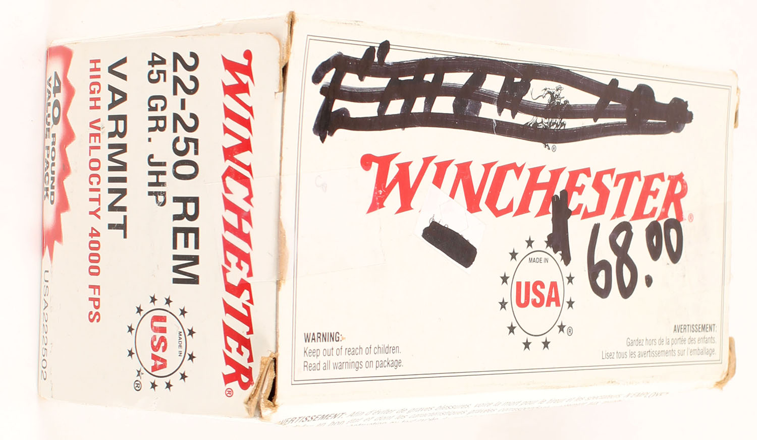 Winchester, USA, .22-250 Remington, 45 Grain Jacketed Hollow Point, High Velocity 4000 FPS, 40 Round Value Pack, Full, 1pc. White red & black box, box is solid with excellent color, top has been written on, some shelf & corner wear, end flaps are solid, ammo is very good to excellent. Grade: Very Good - Value: 40 to 60